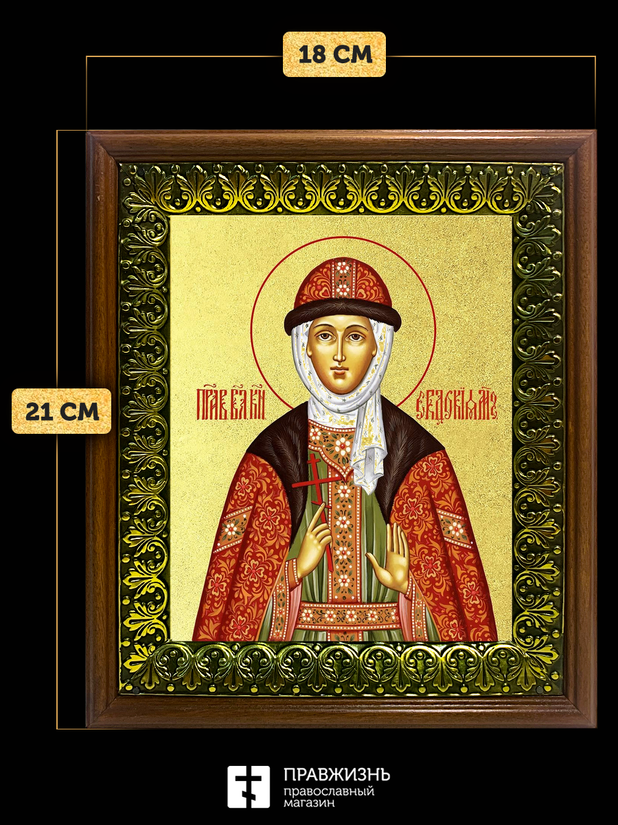 Икона Евдокия Московская праведная с золочением, деревянная рамка с басмой и стеклом 18х21х2,5 см 16