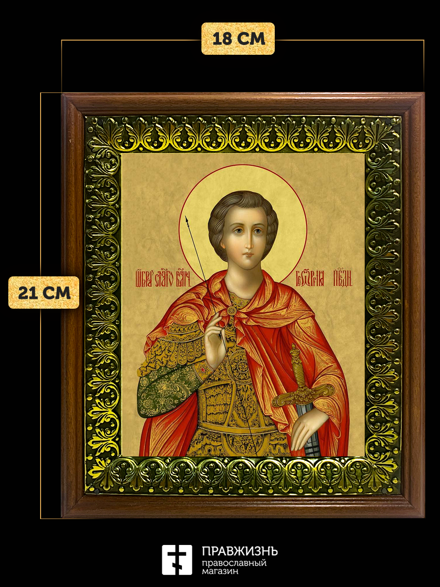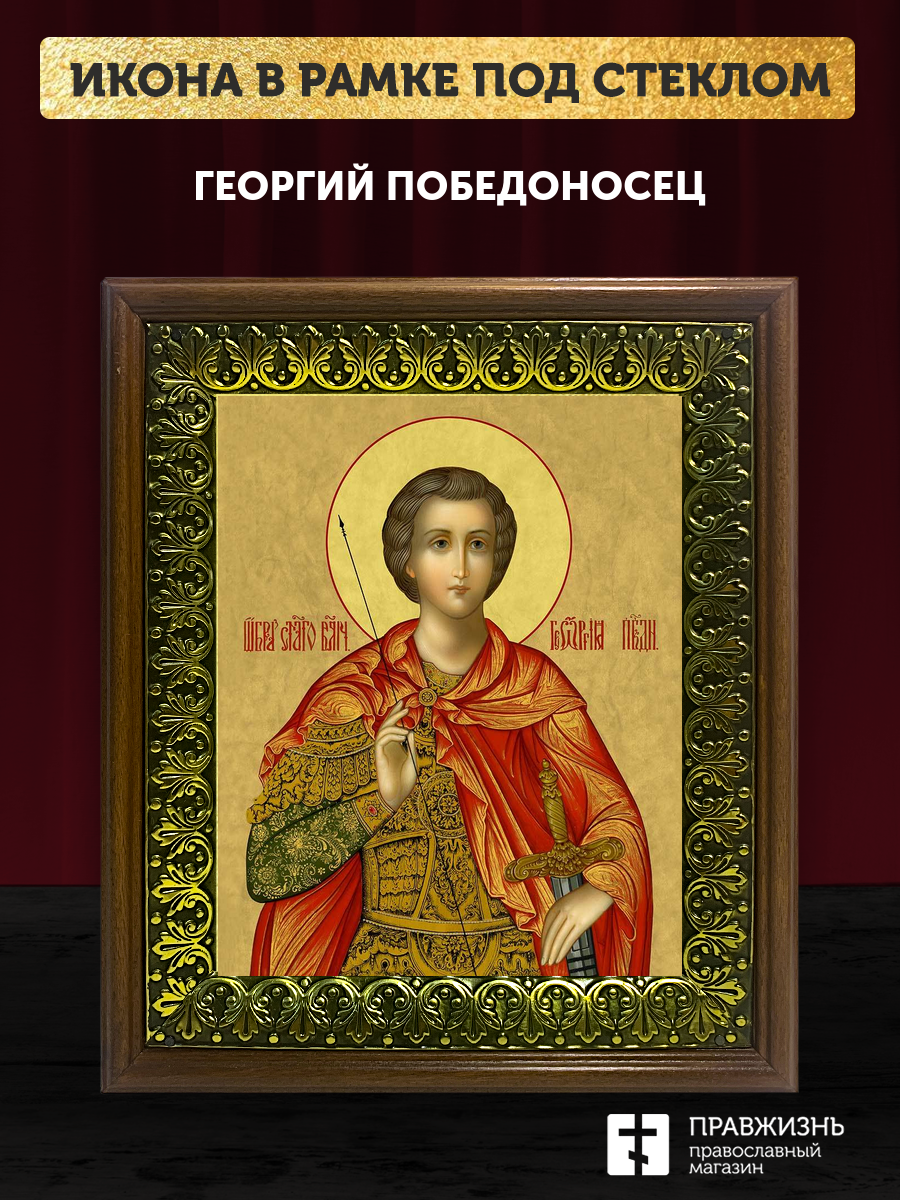 Икона Георгий Победоносец великомученик, деревянная рамка с басмой и стеклом 18х21х2,5 см 058