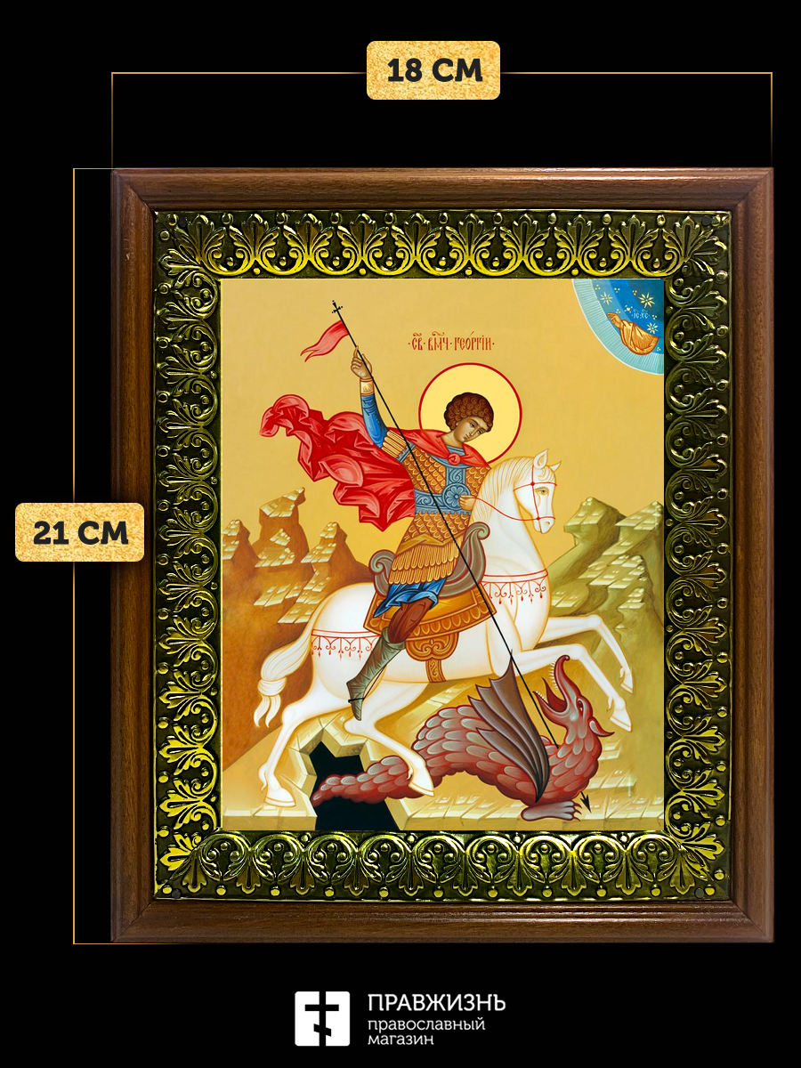 Икона Георгий Победоносец великомученик, деревянная рамка с басмой и стеклом 18х21х2,5 см 058
