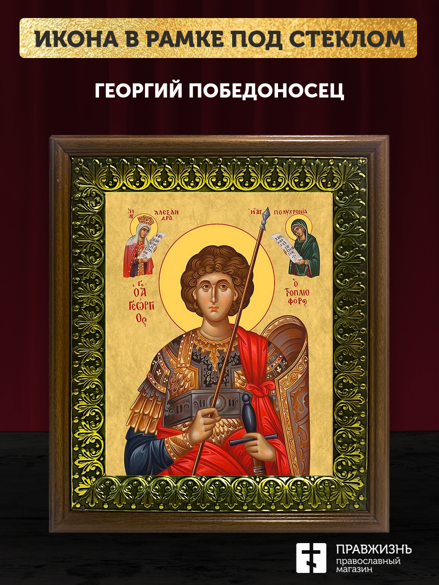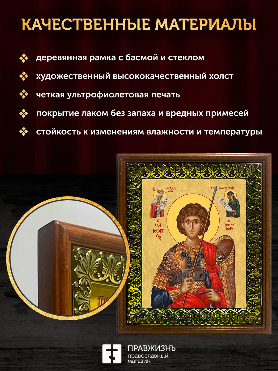 Икона Георгий Победоносец великомученик, деревянная рамка с басмой и стеклом 18х21х2,5 см 058