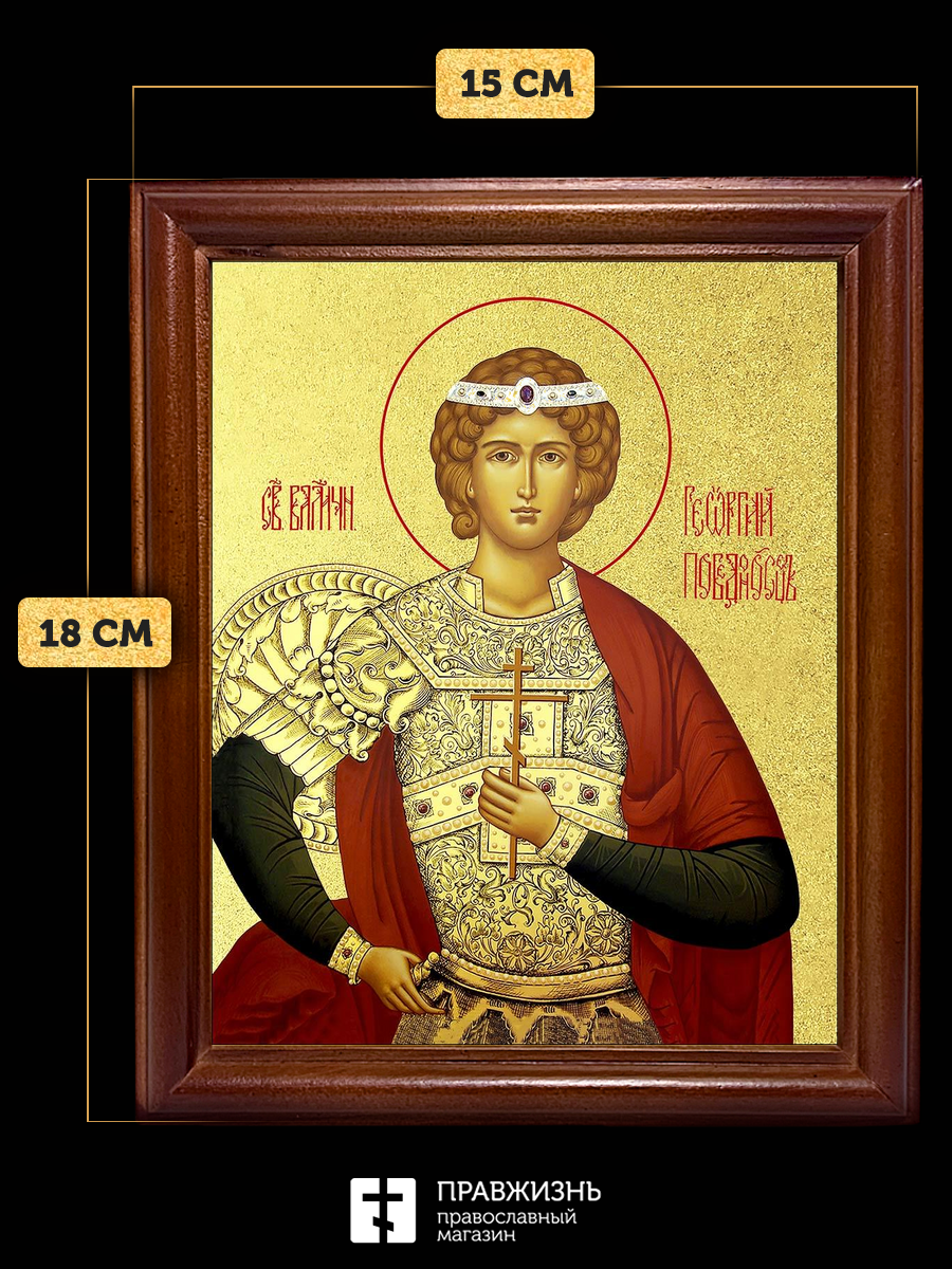Икона Георгий Победоносец великомученик с золочением, деревянная рамка со стеклом 15х18х2 см 058