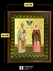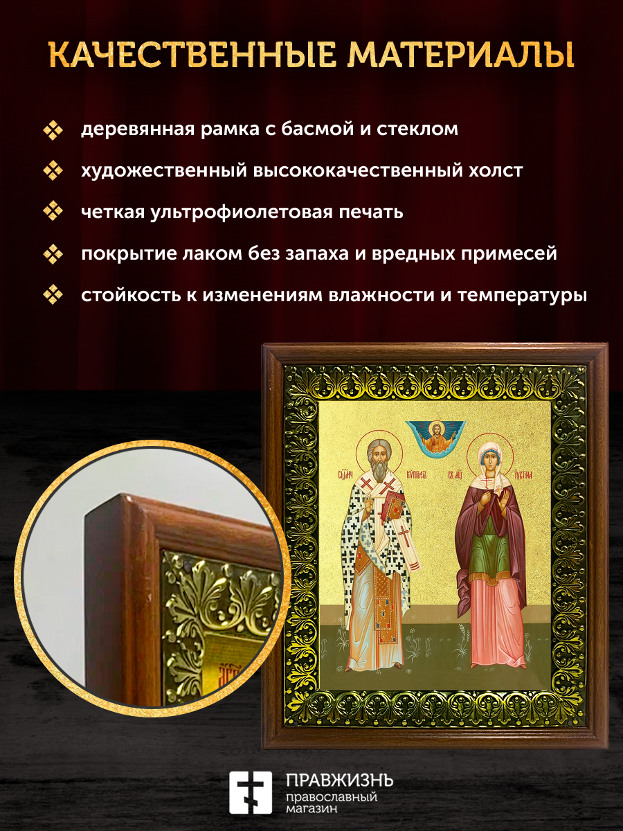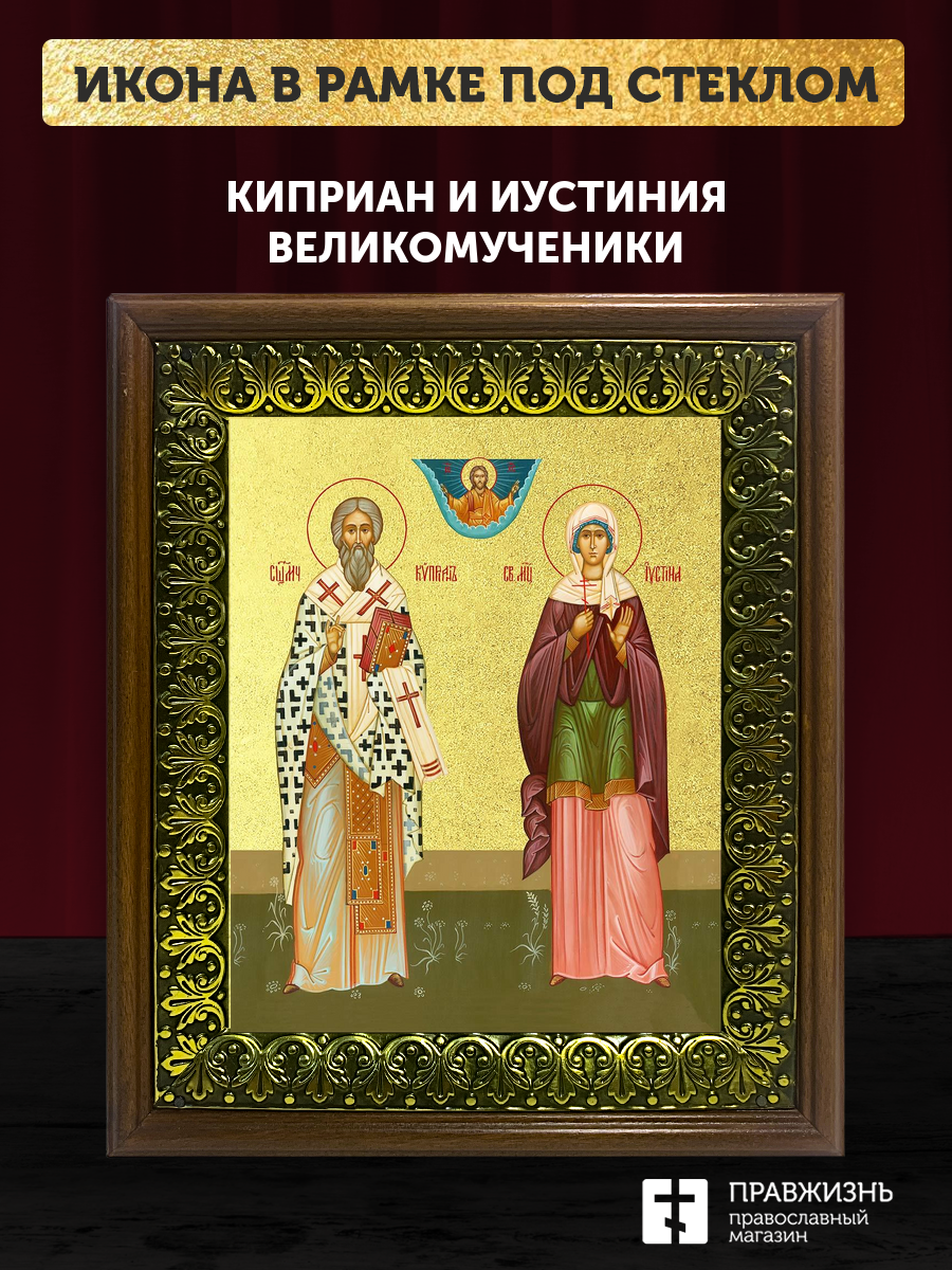 Икона Киприан и Иустиния великомученики с золочением, деревянная рамка с басмой и стеклом 18х21х2,5