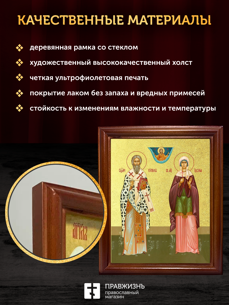 Икона Киприан и Иустиния великомученики с золочением, деревянная рамка со стеклом 15х18х2 см 084