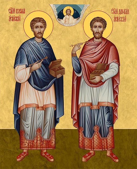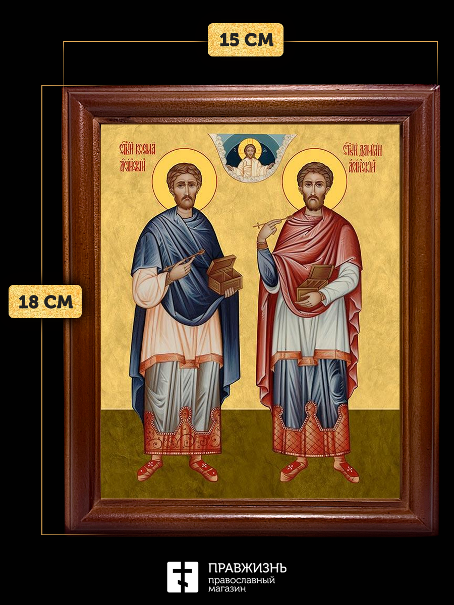 Икона Косьма и Дамиан бессребренники и чудотворцы, деревянная рамка со стеклом 15х18х2 см 1221