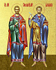 Икона Косьма и Дамиан бессребренники и чудотворцы с золочением, деревянная рамка с басмой и стеклом