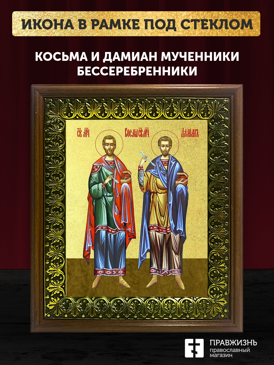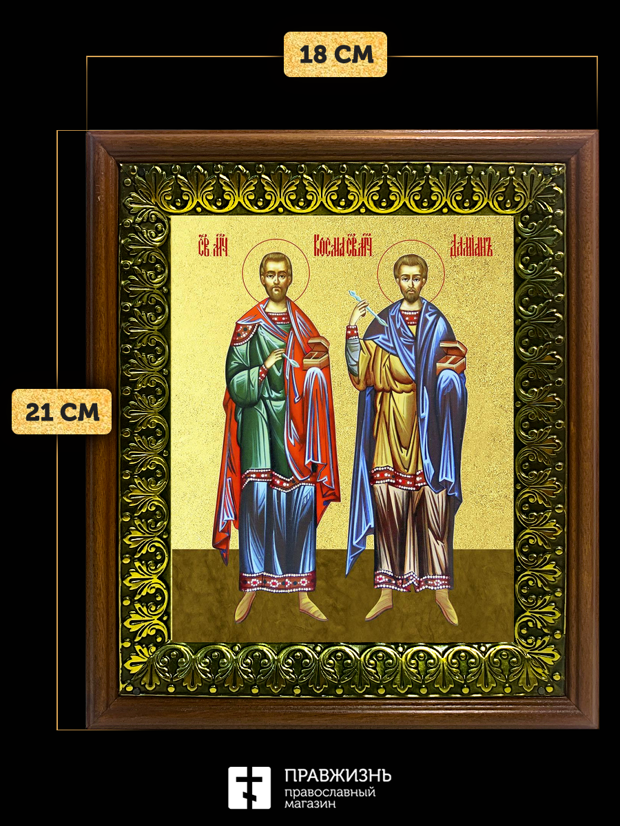 Икона Косьма и Дамиан бессребренники и чудотворцы с золочением, деревянная рамка с басмой и стеклом
