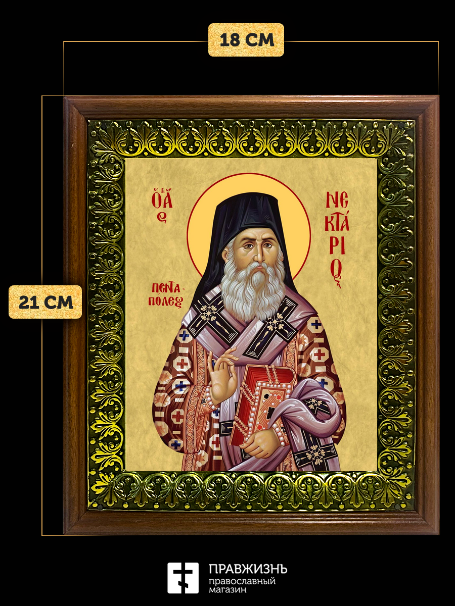 Икона Нектарий Эгинский митрополит, деревянная рамка с басмой и стеклом 18х21х2,5 см 406
