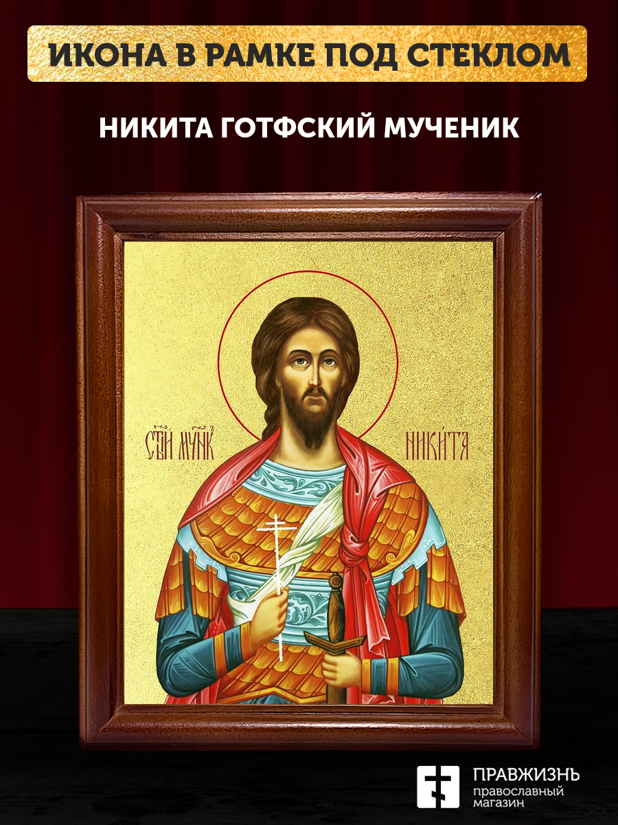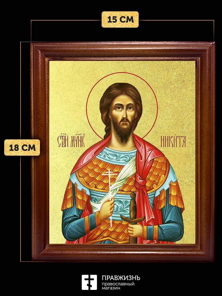 Икона Никита Готфский мученик с золочением, деревянная рамка со стеклом 15х18х2 см 109