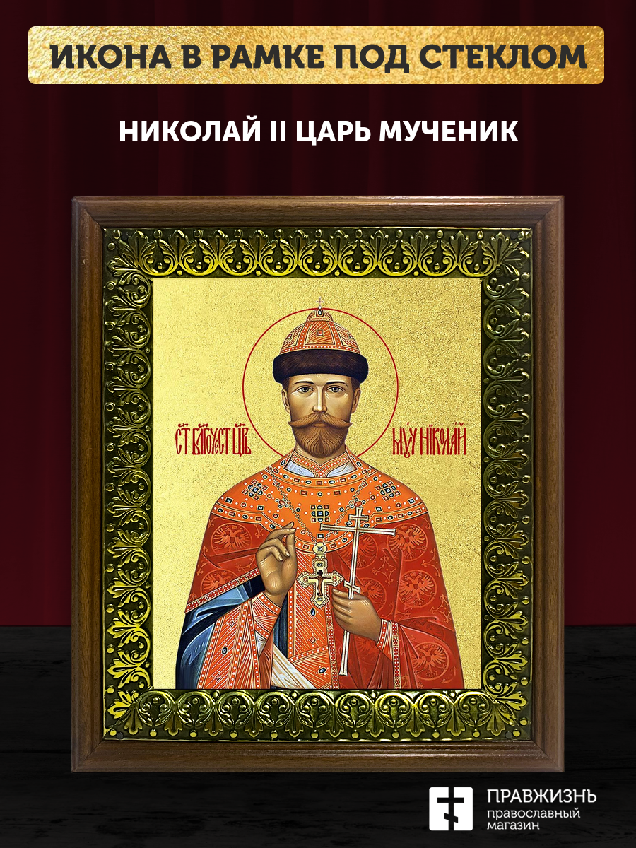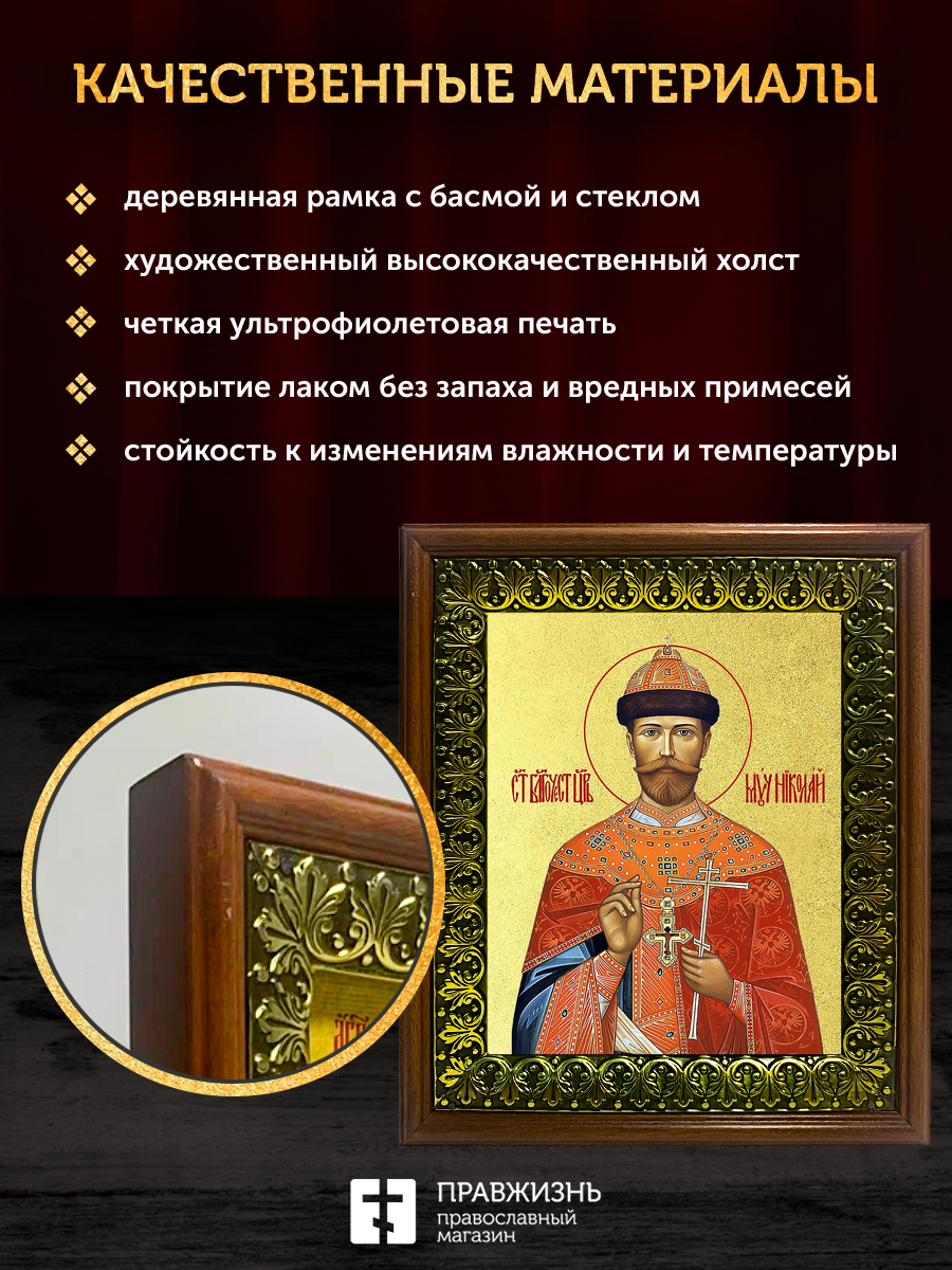 Икона Николай II царь мученик с золочением, деревянная рамка с басмой и стеклом 18х21х2,5 см 378