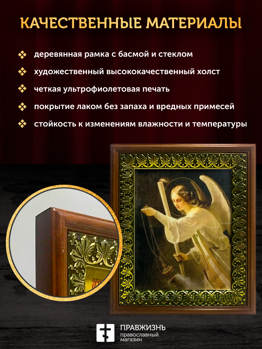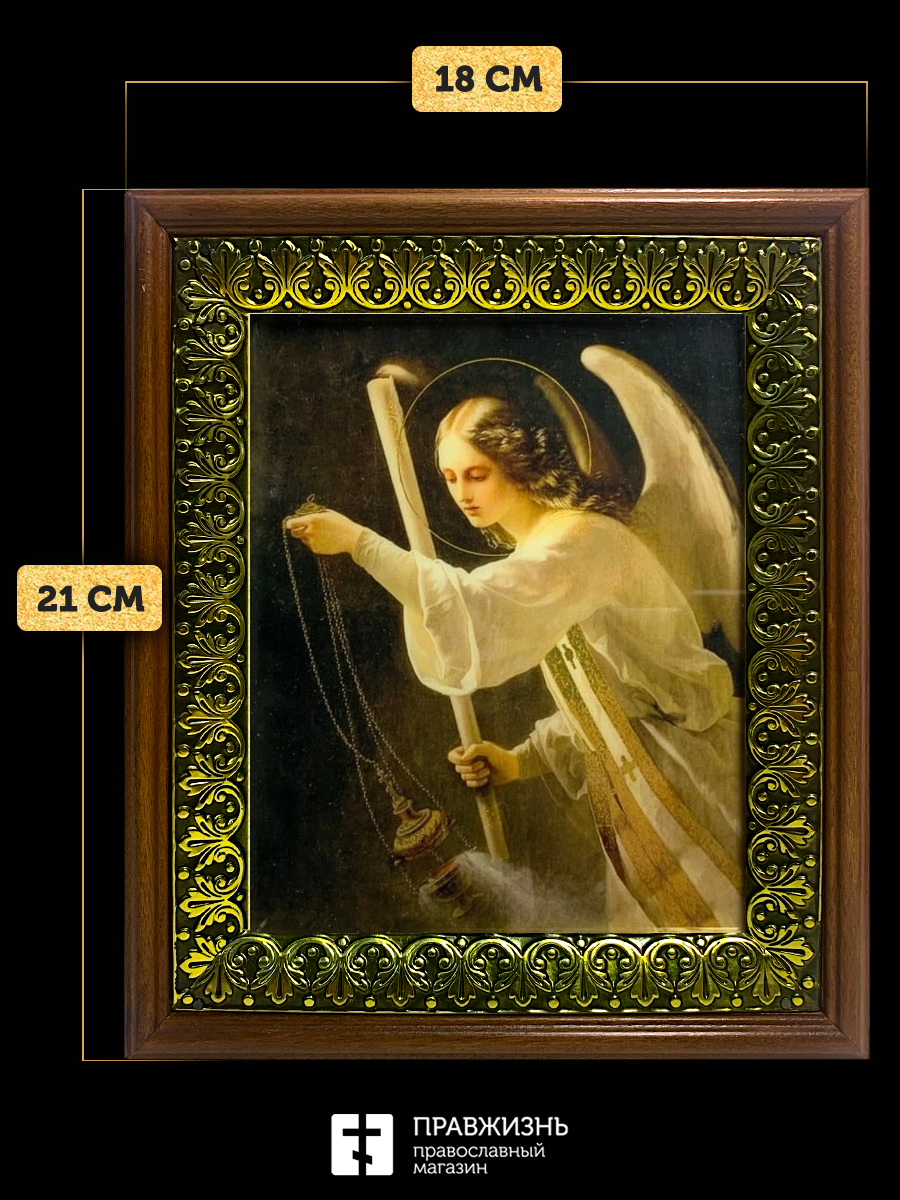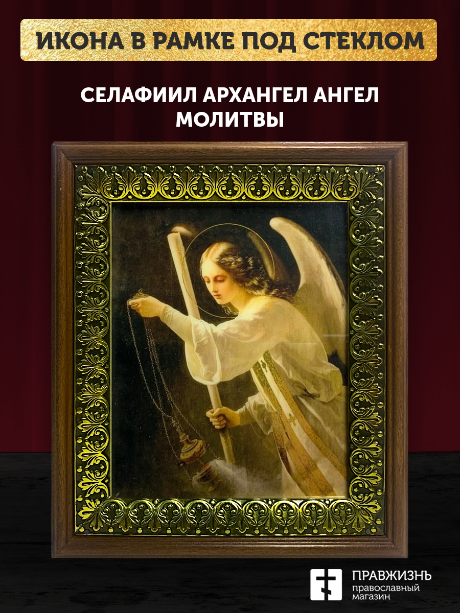 Икона Архангел Селафиил Ангел Молитвы с золочением, деревянная рамка с басмой и стеклом 18х21х2,5 см