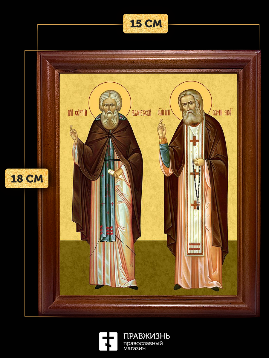 Икона Сергий Радонежский и Серафим Саровский, деревянная рамка со стеклом 15х18х2 см