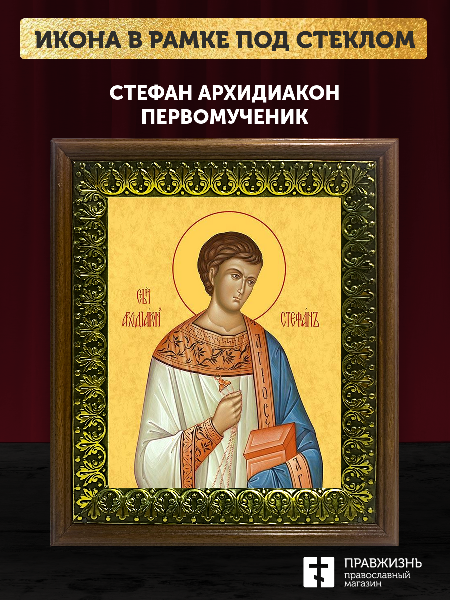 Икона Стефан архидиакон первомученик, деревянная рамка с басмой и стеклом 18х21х2,5 см 318