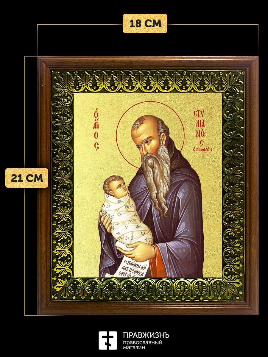 Икона Стилиан Пафлагонский преподобный с золочением, деревянная рамка с басмой и стеклом 18х21х2,5 с
