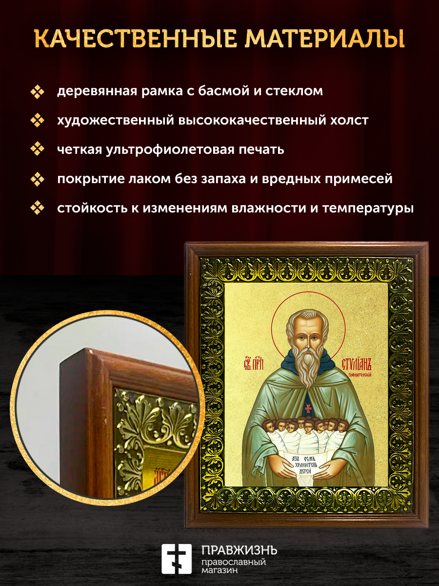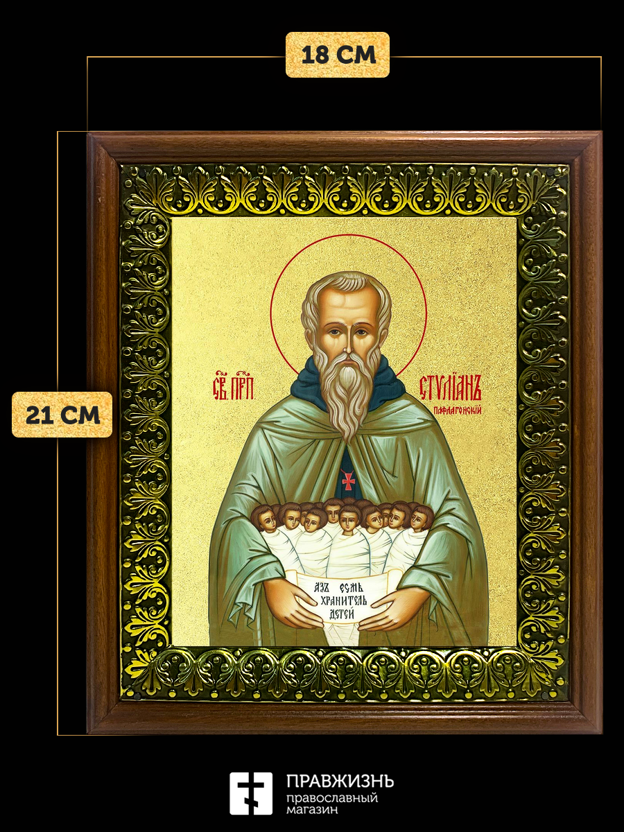Икона Стилиан Пафлагонский преподобный с золочением, деревянная рамка с басмой и стеклом 18х21х2,5 с