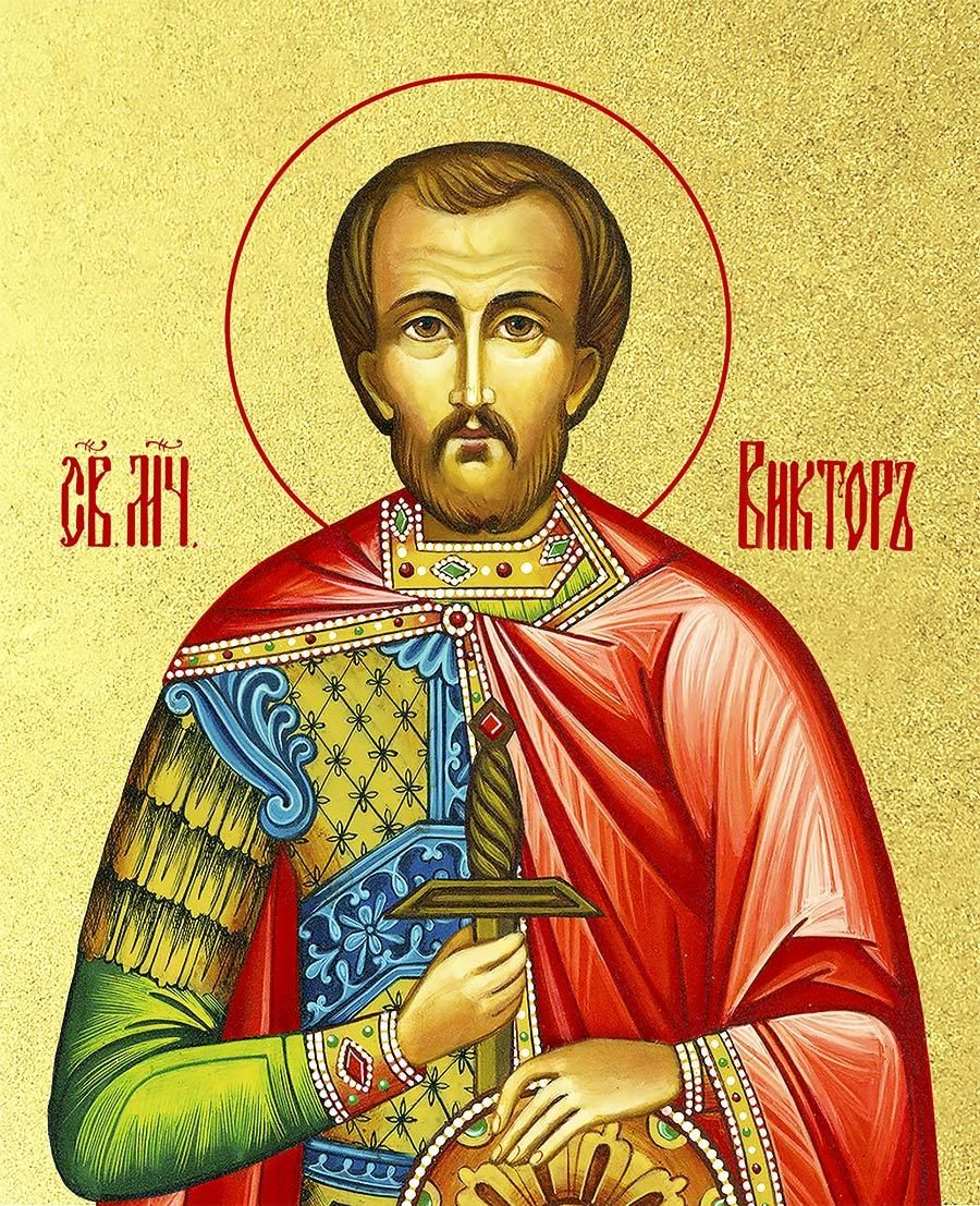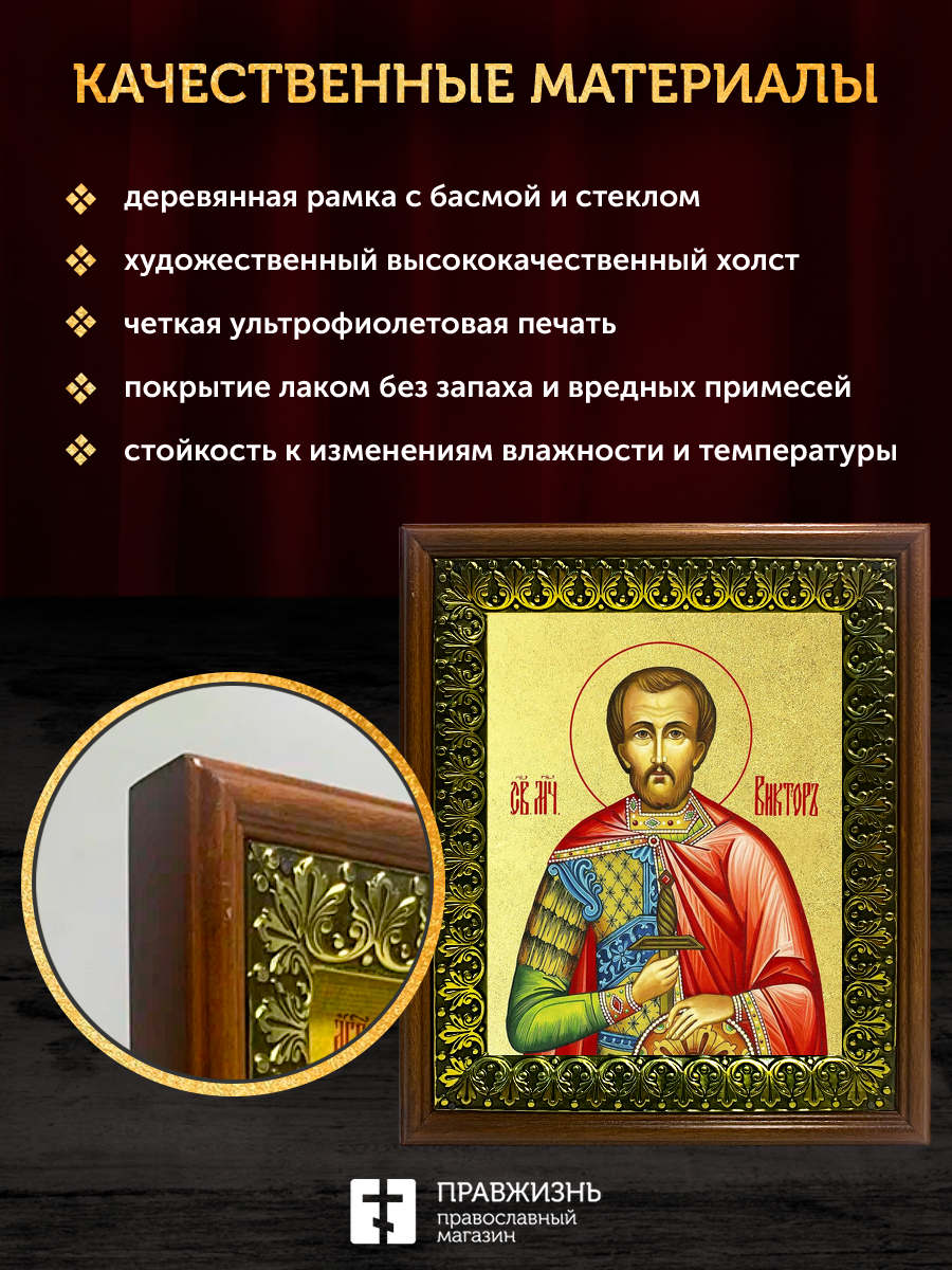 Икона Виктор Халкидонский мученик с золочением, деревянная рамка с басмой и стеклом 18х21х2,5 см 046