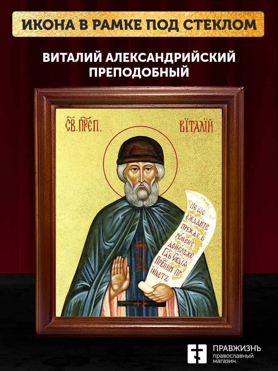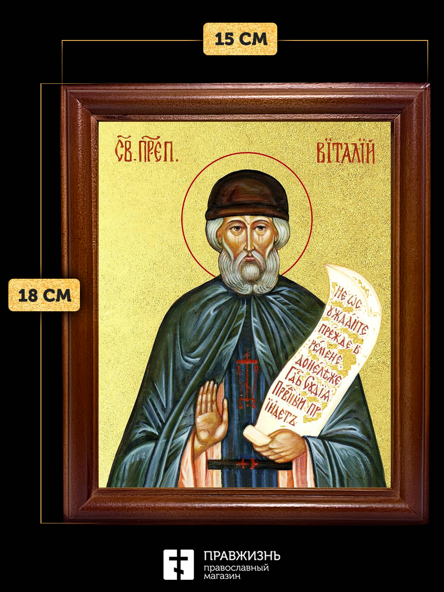 Икона Виталий Александрийский преподобный с золочением, деревянная рамка со стеклом 15х18х2 см 048