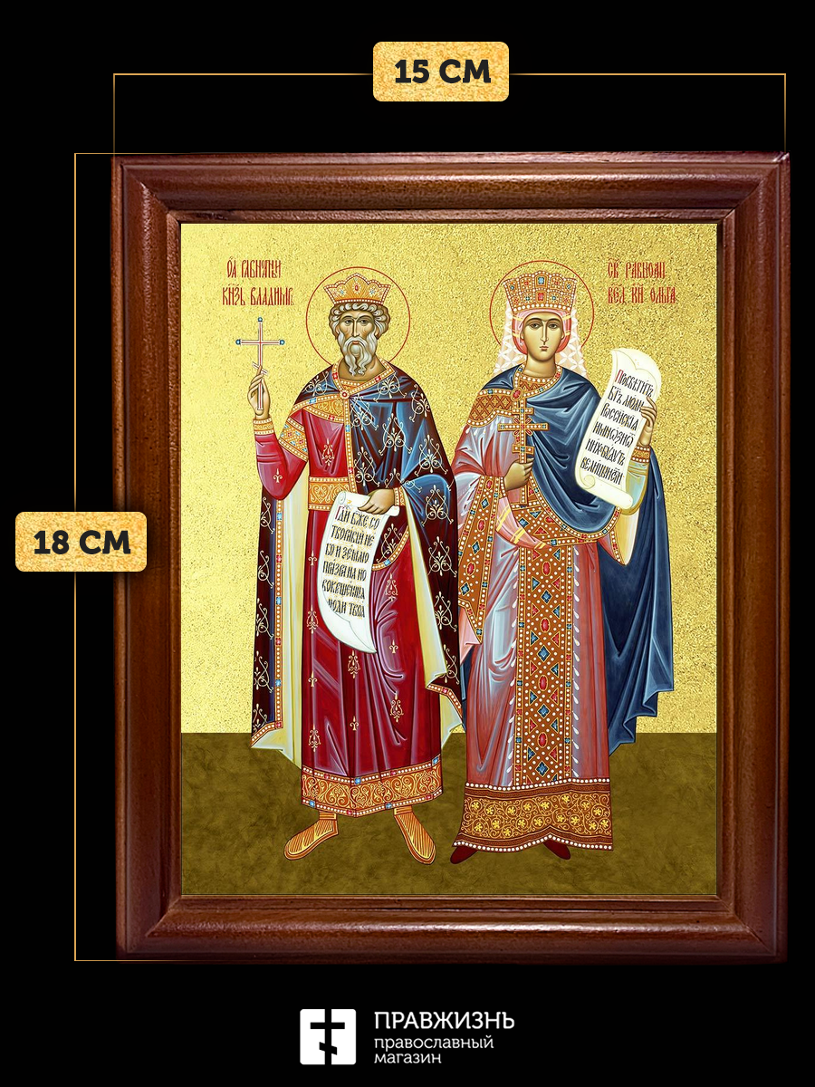 Икона Владимир и Ольга равноапостольные с золочением, деревянная рамка со стеклом 15х18х2 см