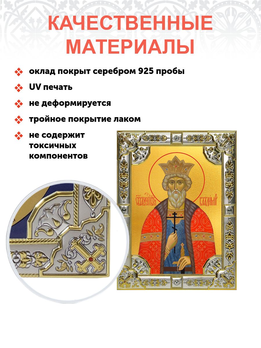 Обычно он изображается в княжеских одеждах, символизирующих его высокий статус и власть. В руках он держит крест – символ новой веры, которую он принес на Русь, и свиток, олицетворяющий его мудрые законы и наставления. Лик князя исполнен спокойствия и достоинства, отражая его духовную силу и решимость.