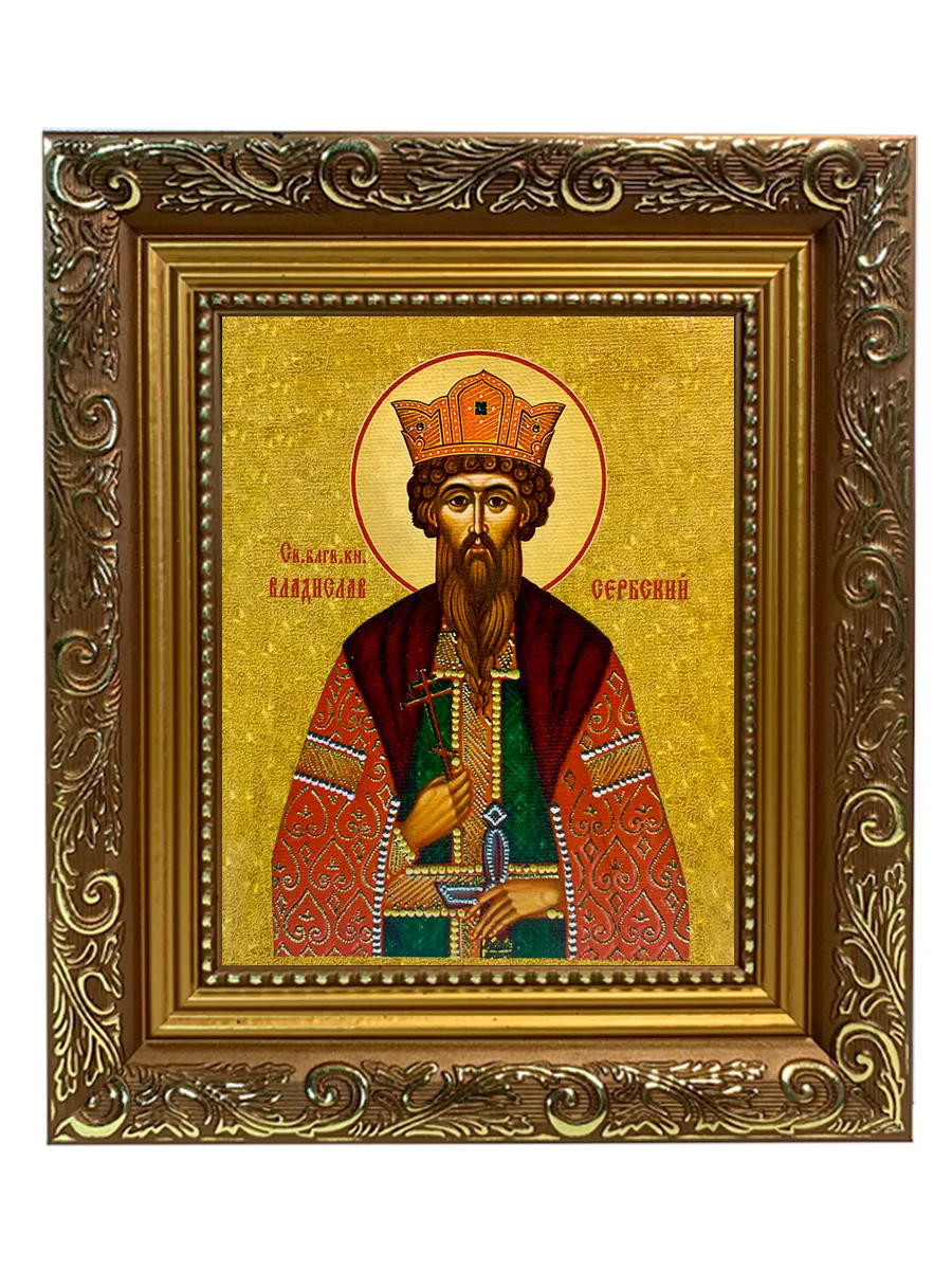 Именная икона Владислав Сербский Благоверный Князь на холсте в киоте 051
