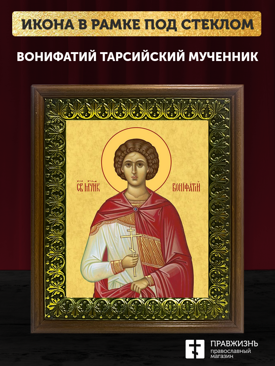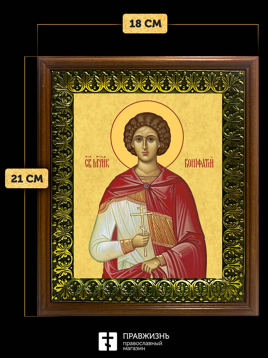 Икона Вонифатий Тарсийский мученик, деревянная рамка с басмой и стеклом 18х21х2,5 см 913