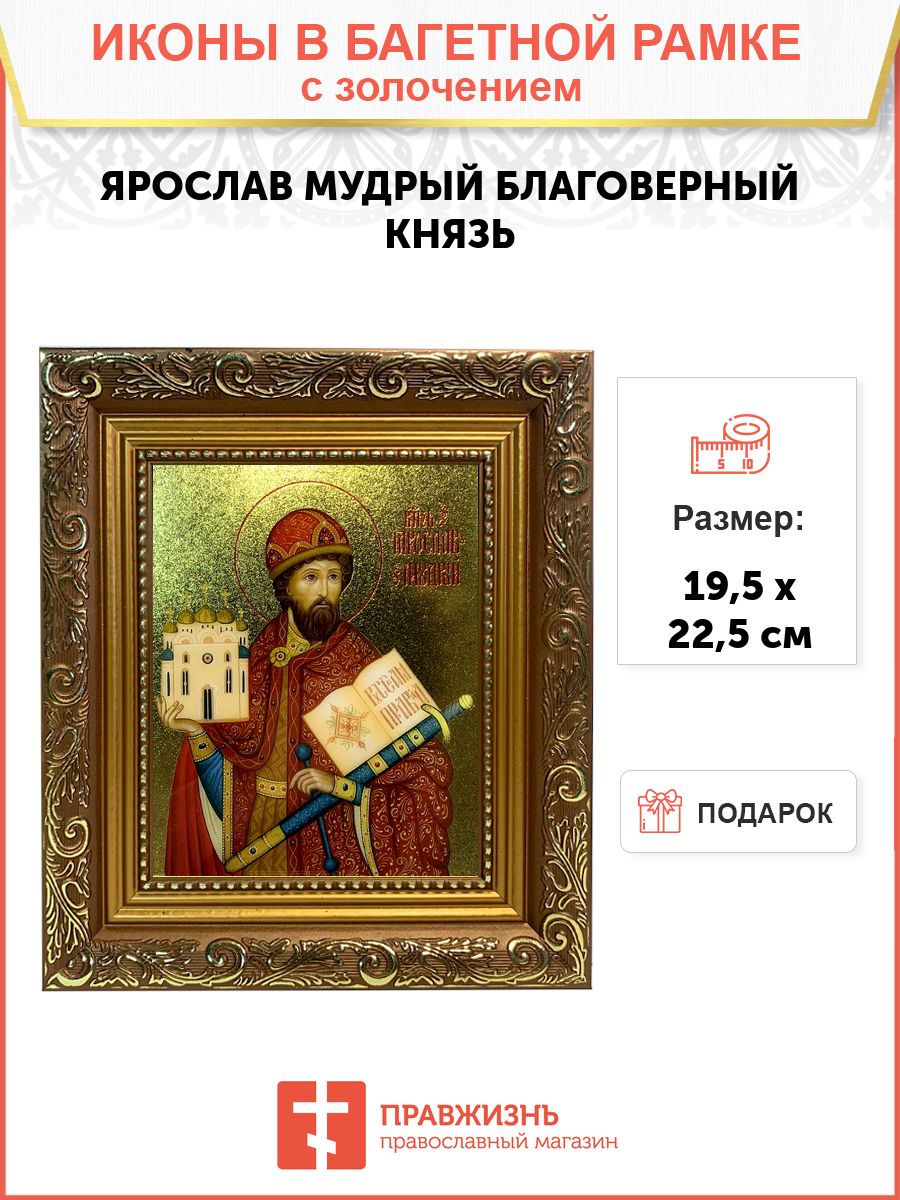 Икона Ярослав Мудрый благоверный князь с золочением, широкая рамка 19,5х22,5х2 см