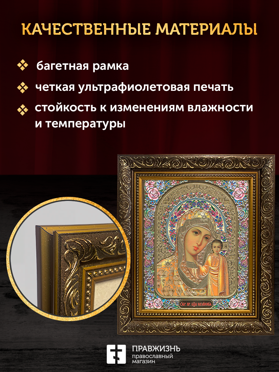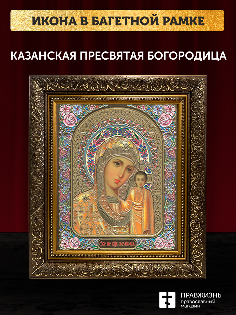 Икона Казанская Божия Матерь, бронзовая багетная рамка узкая с узором 15х18 см