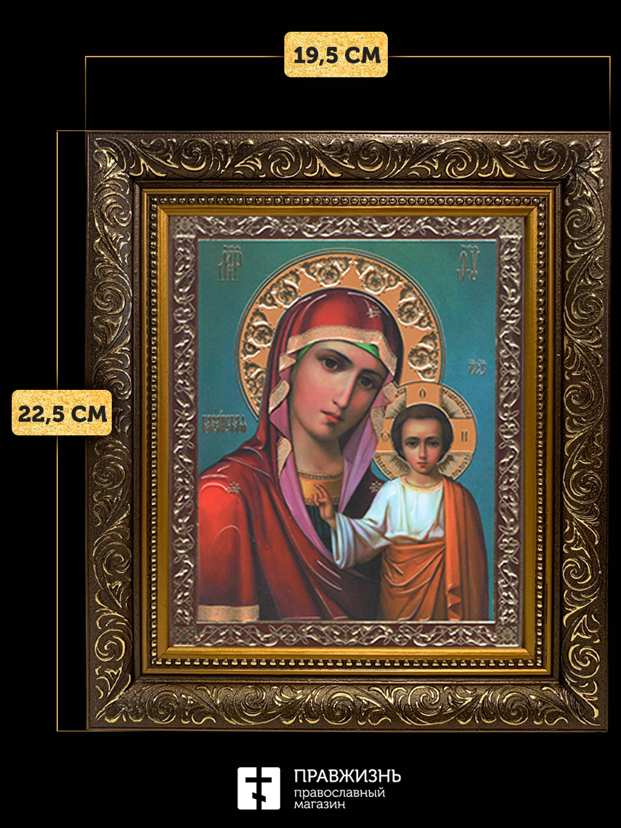 Икона Казанская Божия Матерь, бронзовая багетная рамка узкая с узором 15х18 см