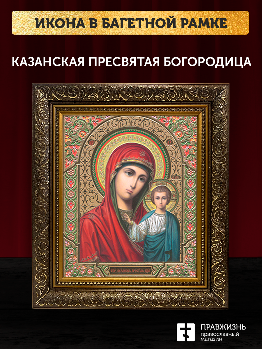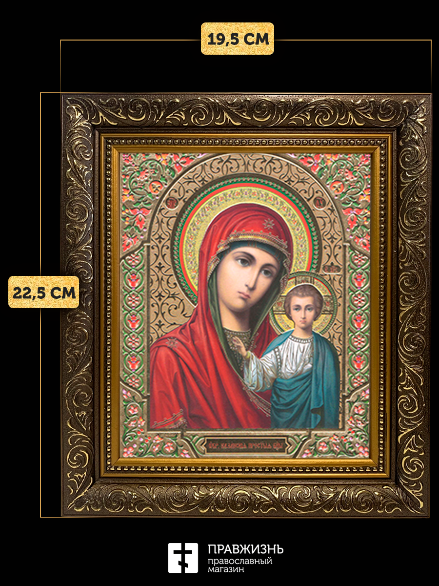 Икона Казанская Божия Матерь, бронзовая багетная рамка узкая с узором 15х18 см