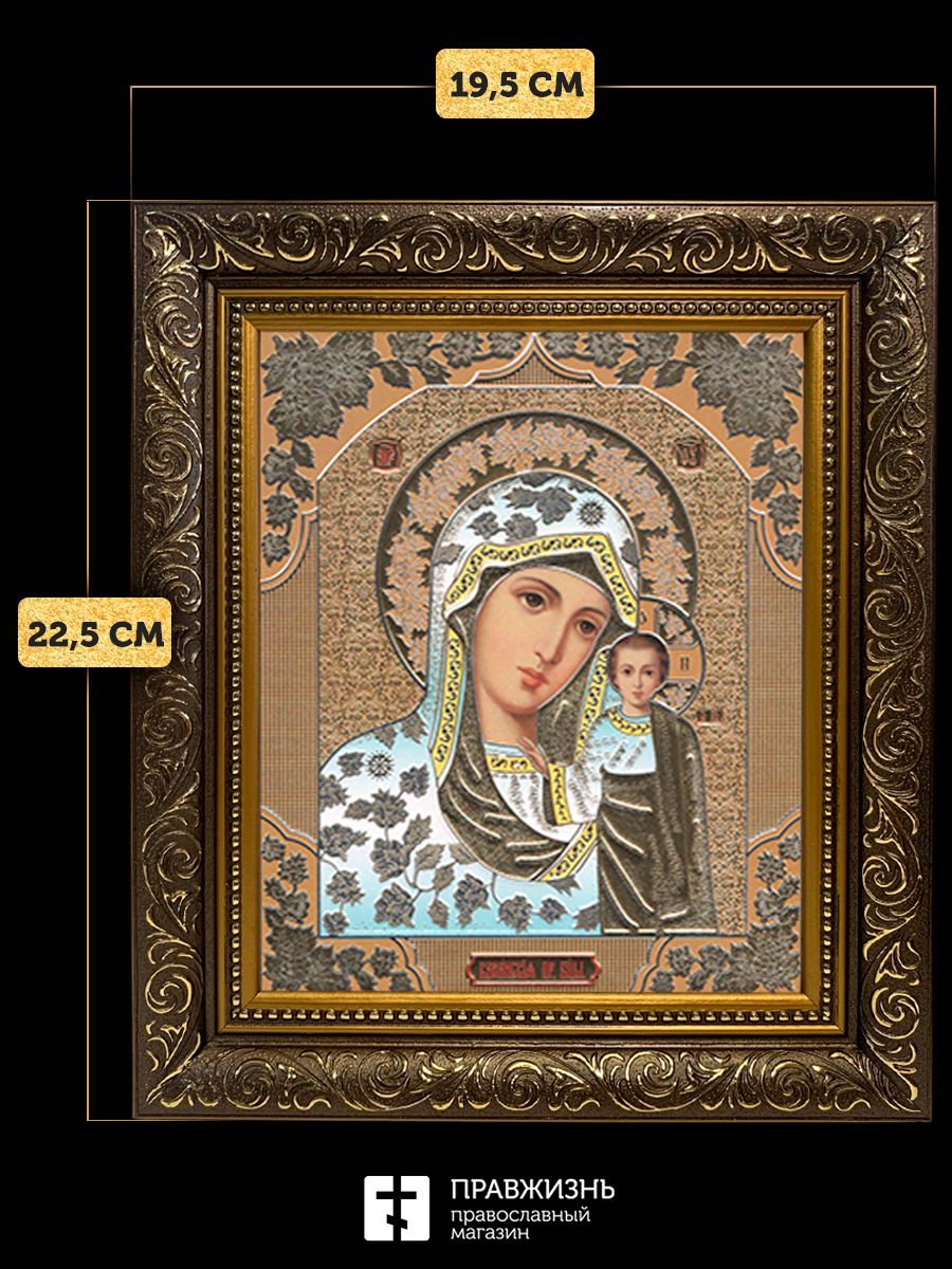 Икона Казанская Божия Матерь, бронзовая багетная рамка узкая с узором 15х18 см
