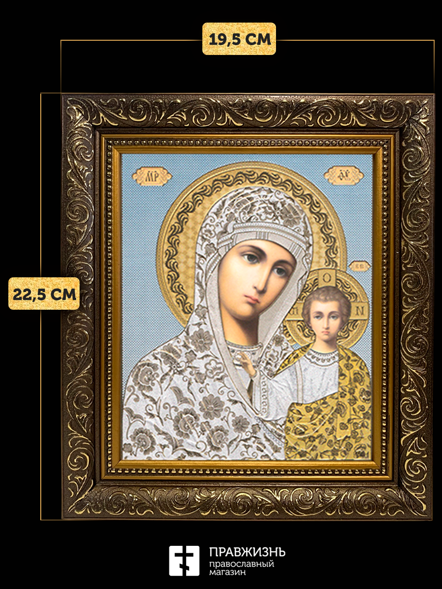 Икона Казанская Божия Матерь, бронзовая багетная рамка узкая с узором 15х18 см