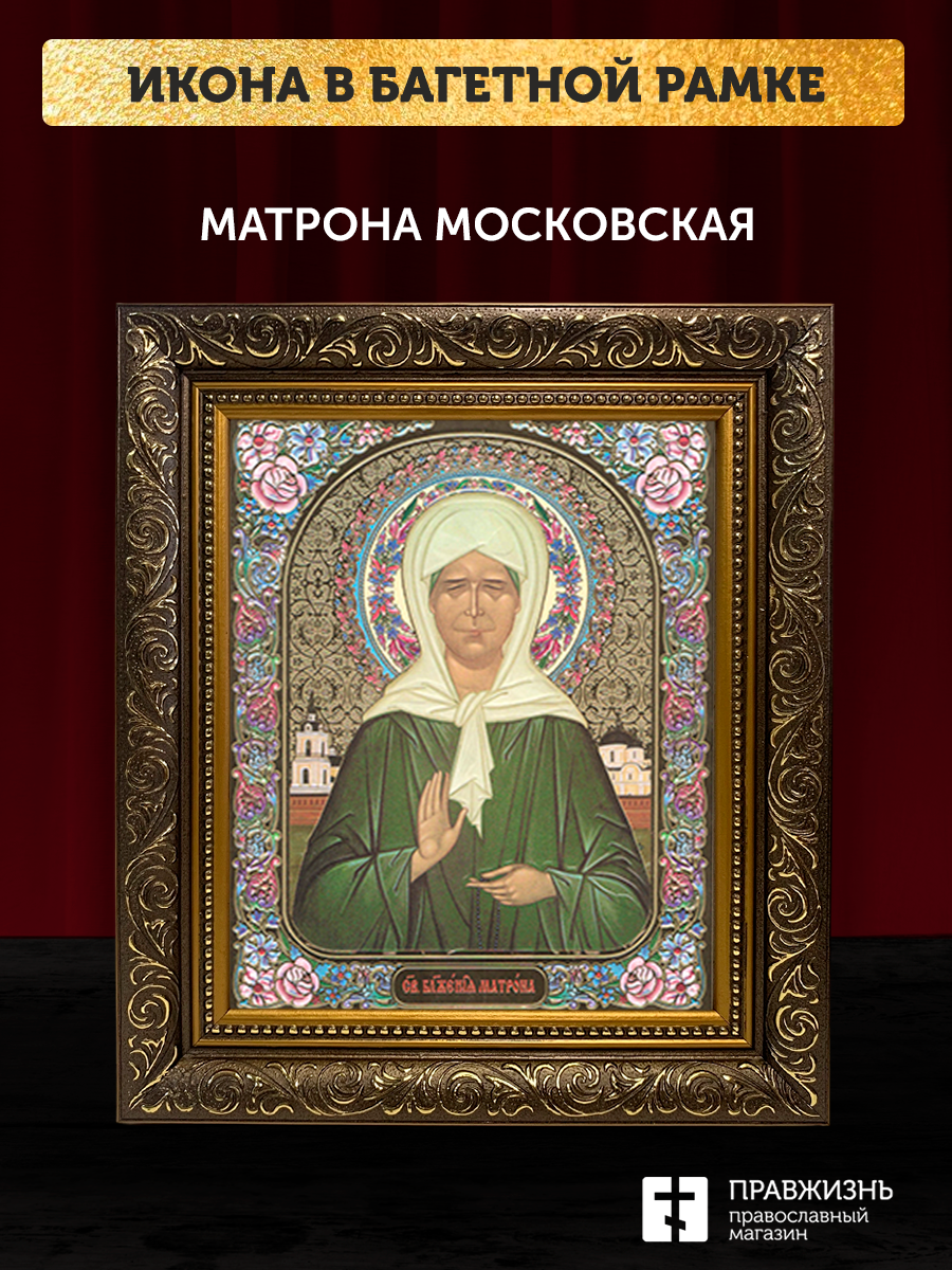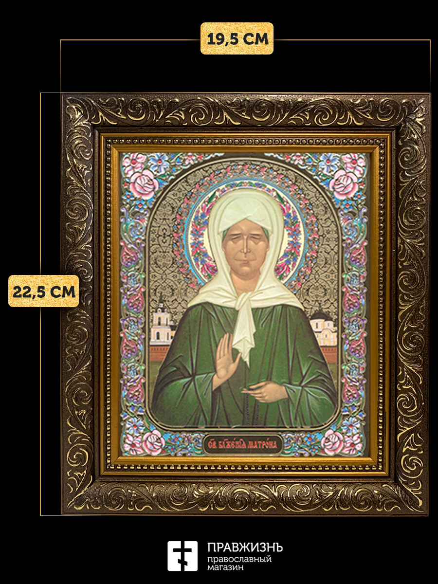 Икона Матрона Московская, бронзовая багетная рамка узкая с узором 15х18 см