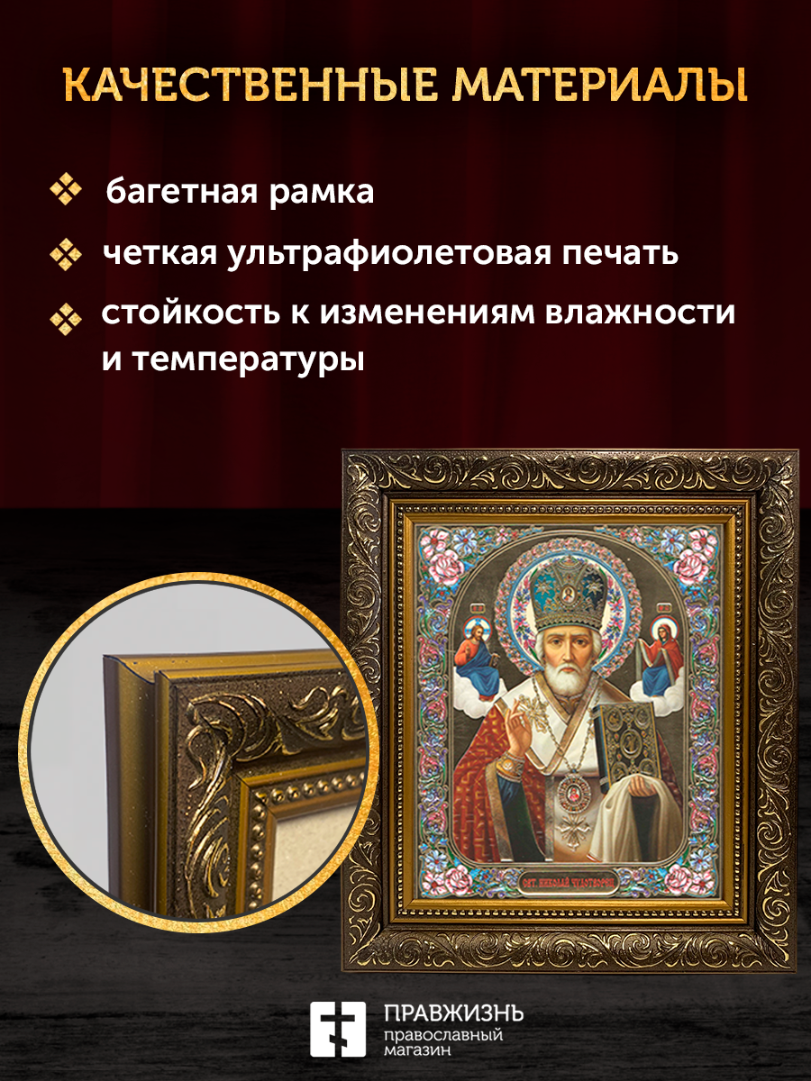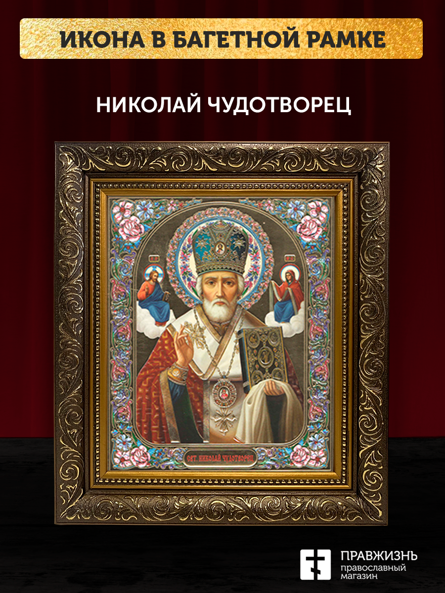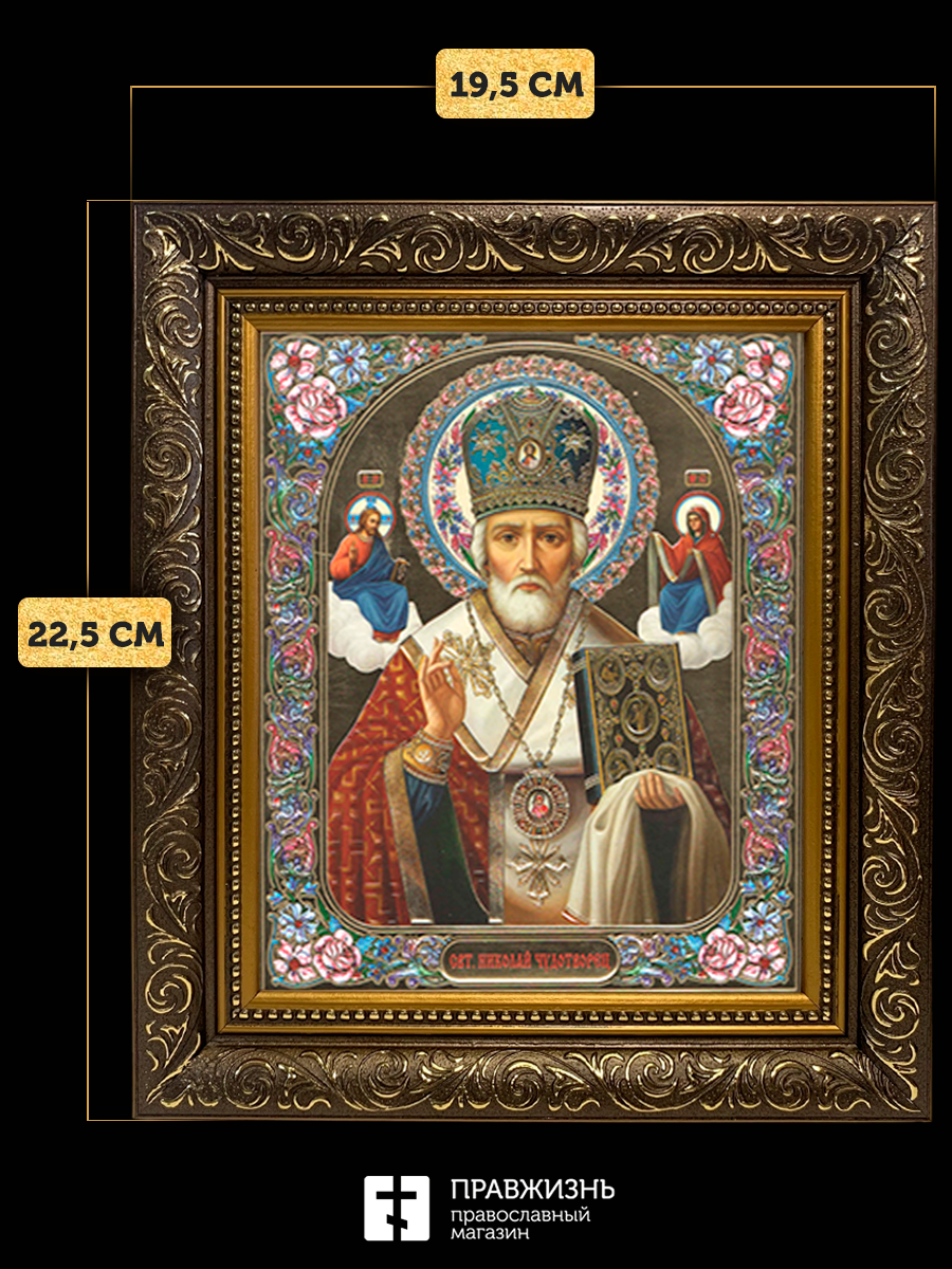 Икона Николай Чудотворец, бронзовая багетная рамка узкая с узором 15х18 см