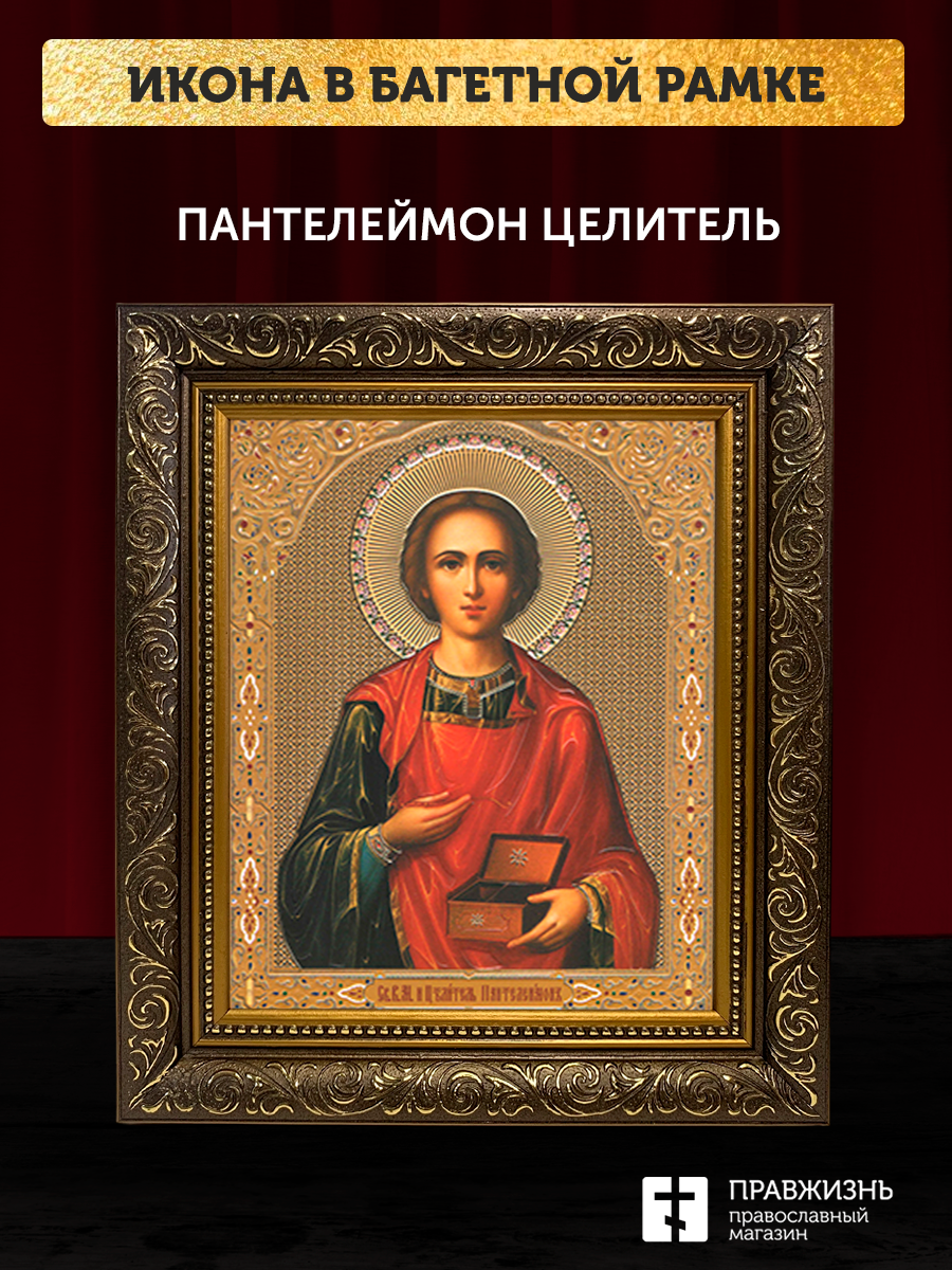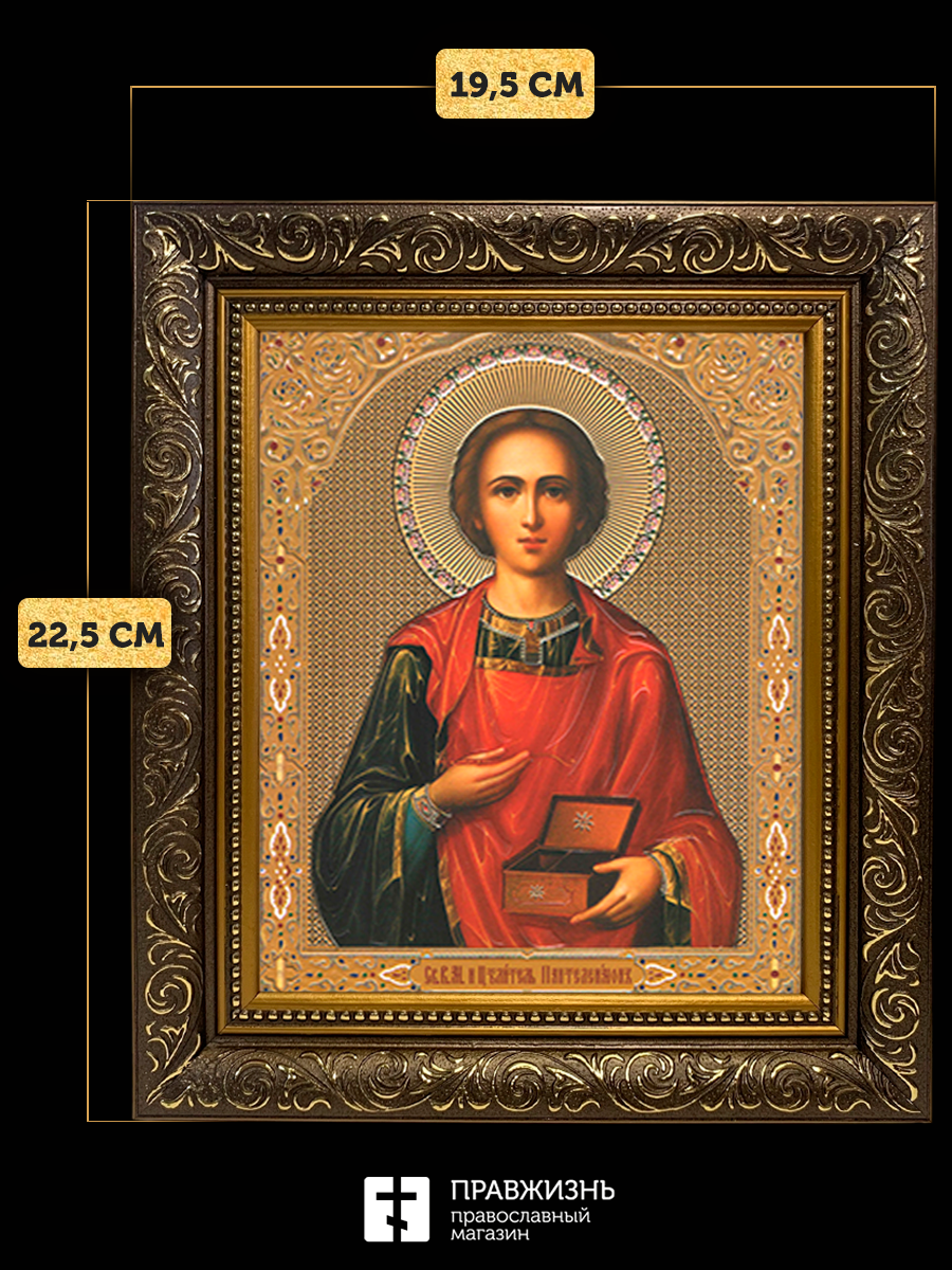 Икона Пантелеймон Целитель, бронзовая багетная рамка узкая с узором 15х18 см