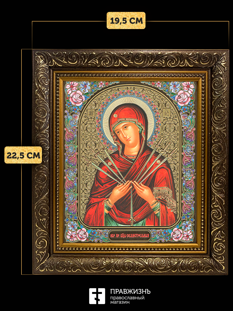 Икона Семистрельная Божия Матерь, бронзовая багетная рамка узкая с узором 15х18 см