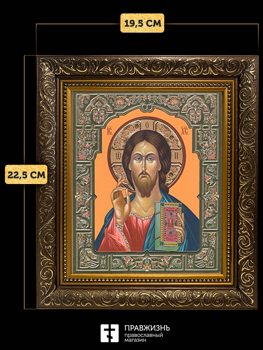 Икона Спаситель, бронзовая багетная рамка узкая с узором 15х18 см