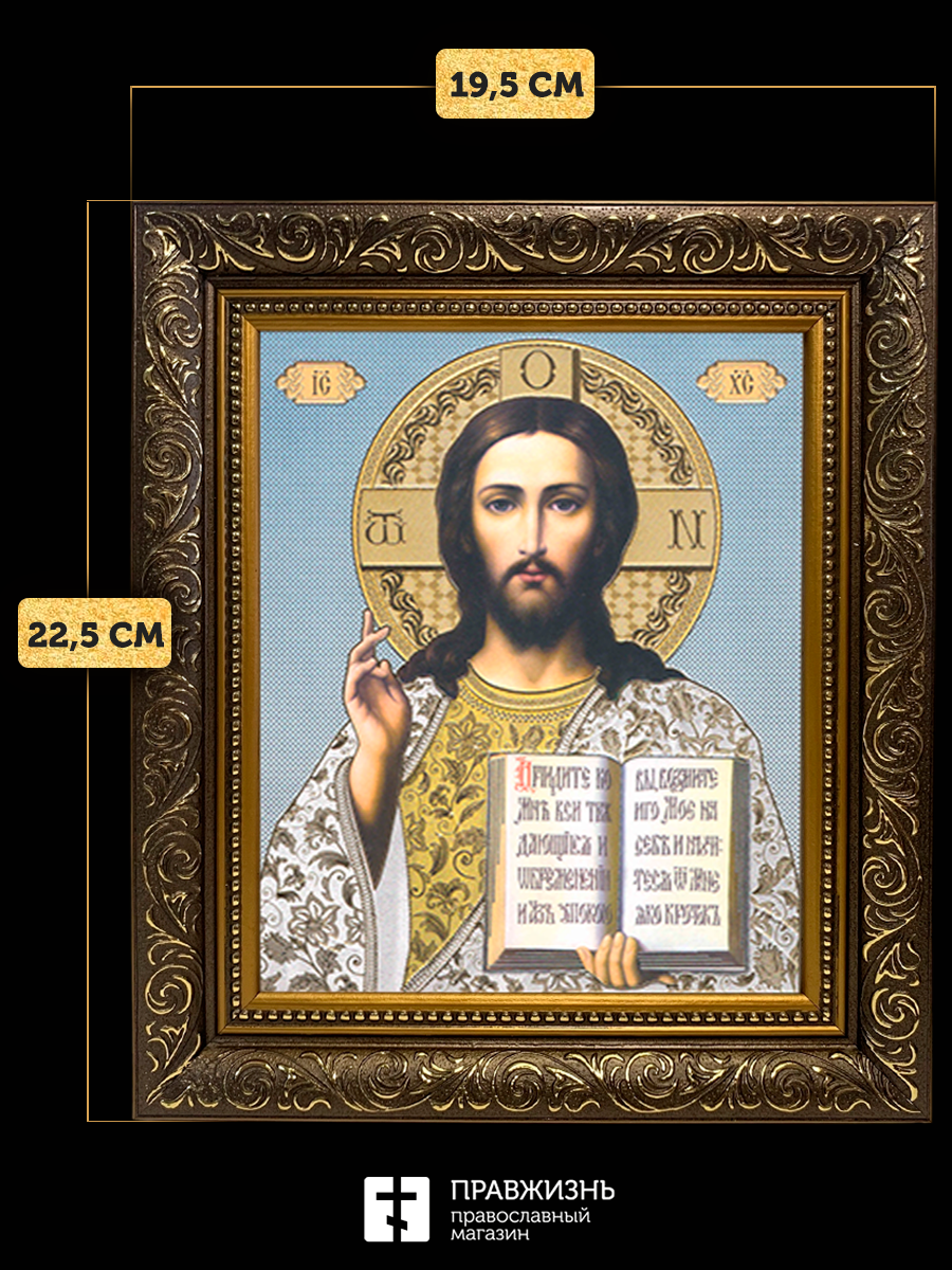 Икона Спаситель, бронзовая багетная рамка узкая с узором 15х18 см