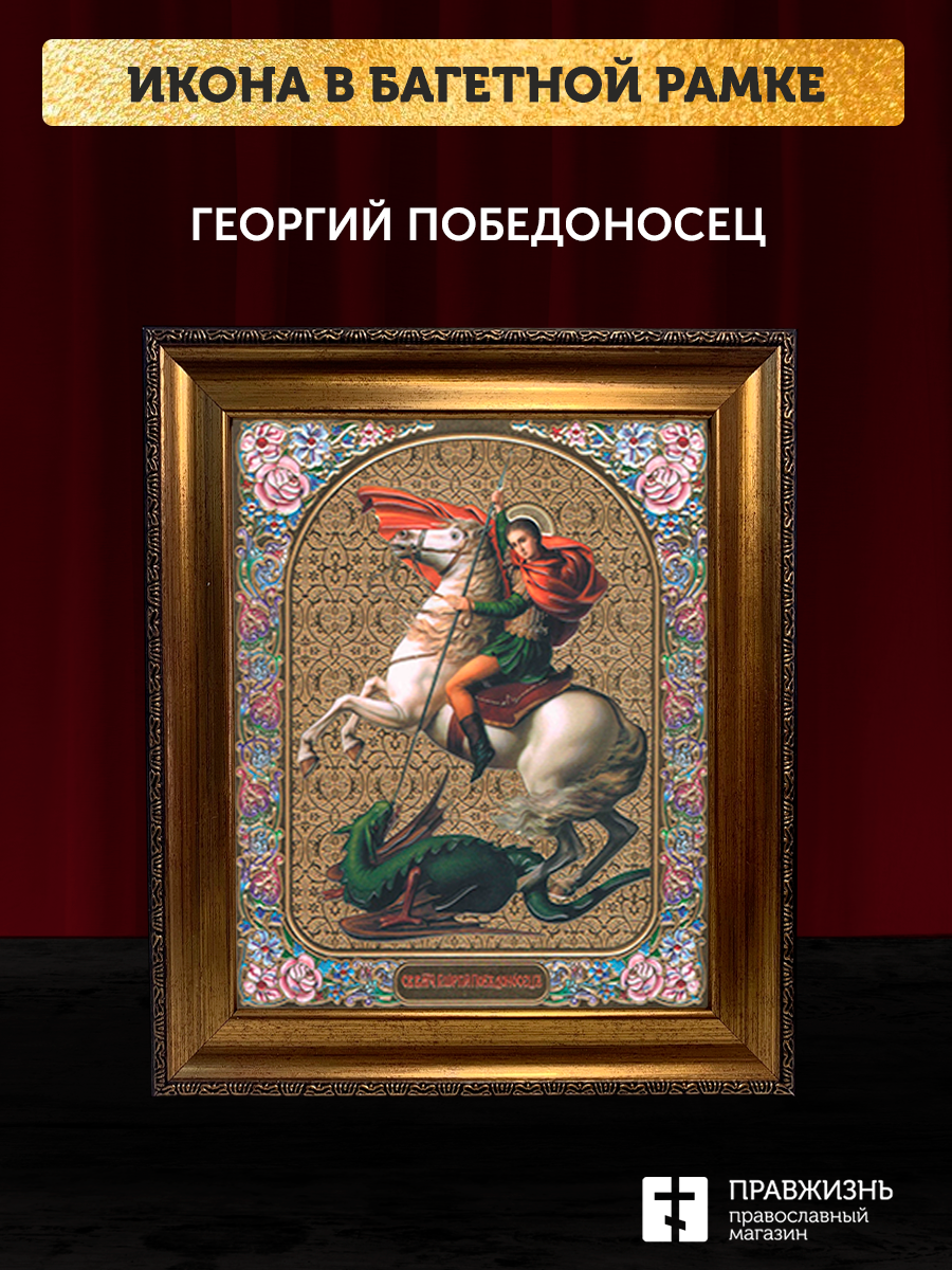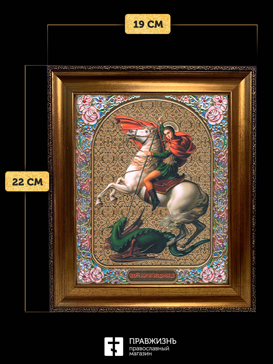 Икона Георгий Победоносец, бронзовая багетная рамка узкая с узором 15х18 см