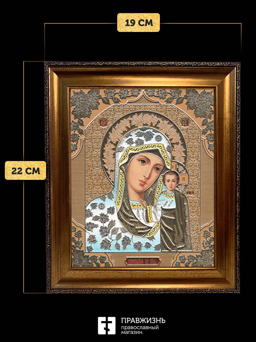 Икона Казанская Божия Матерь, бронзовая багетная рамка узкая с узором 15х18 см