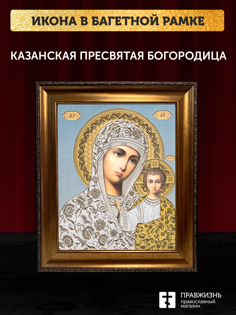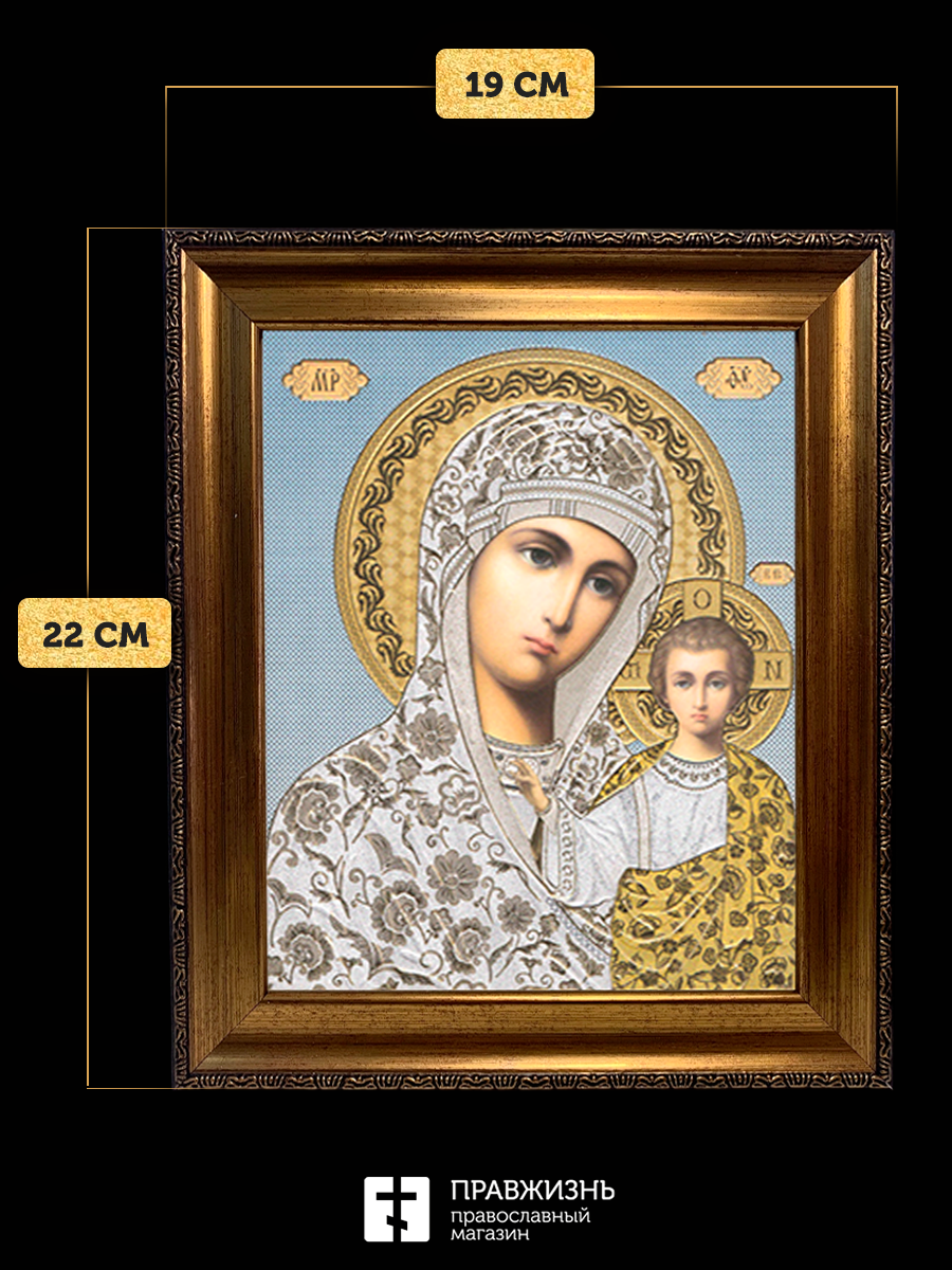 Икона Казанская Божия Матерь, бронзовая багетная рамка узкая с узором 15х18 см