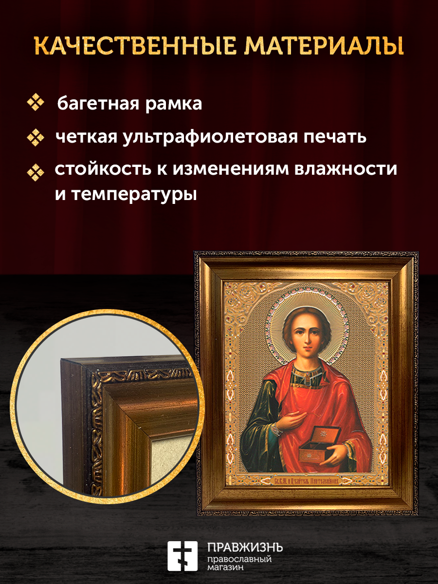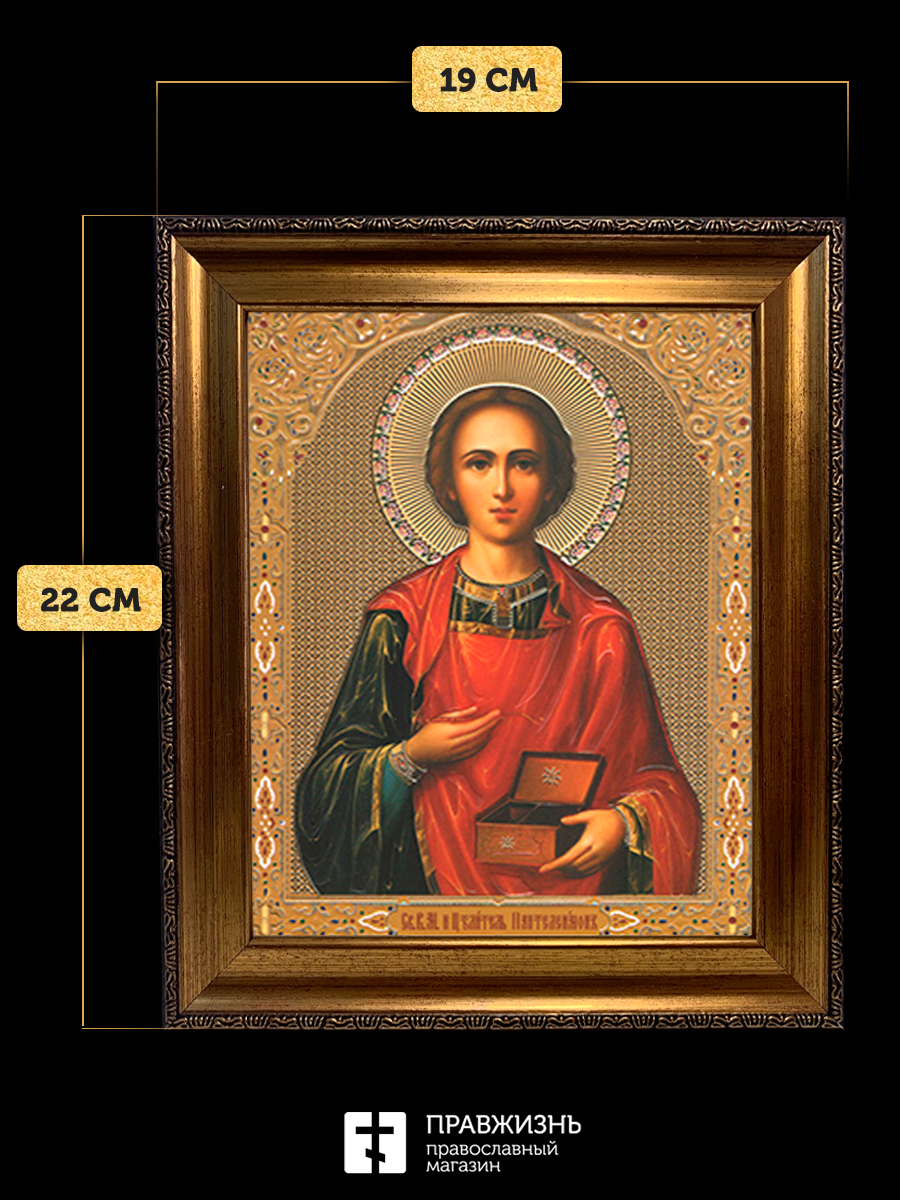 Икона Пантелеймон Целитель, бронзовая багетная рамка узкая с узором 15х18 см