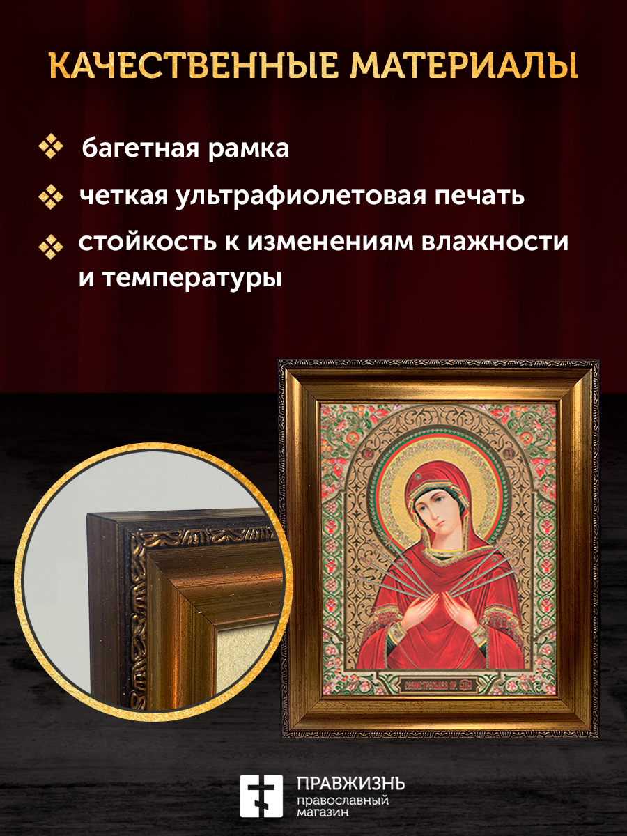 Икона Семистрельная Божия Матерь, бронзовая багетная рамка узкая с узором 15х18 см