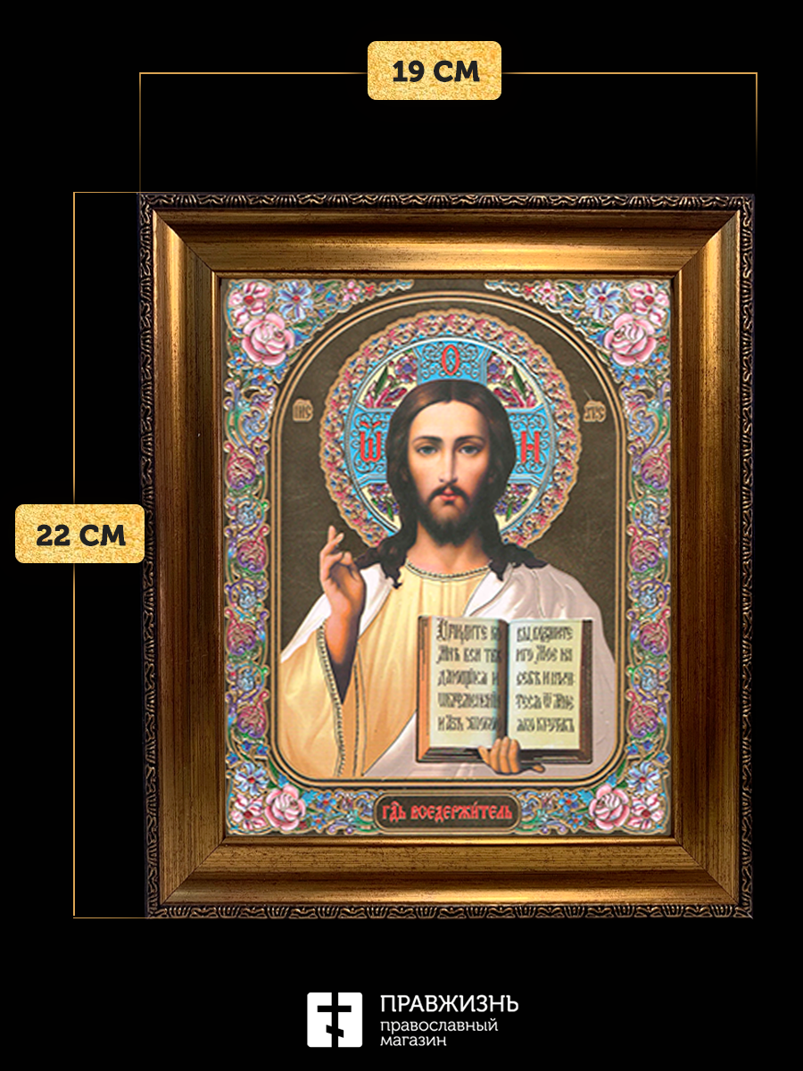 Икона Спаситель, бронзовая багетная рамка узкая с узором 15х18 см