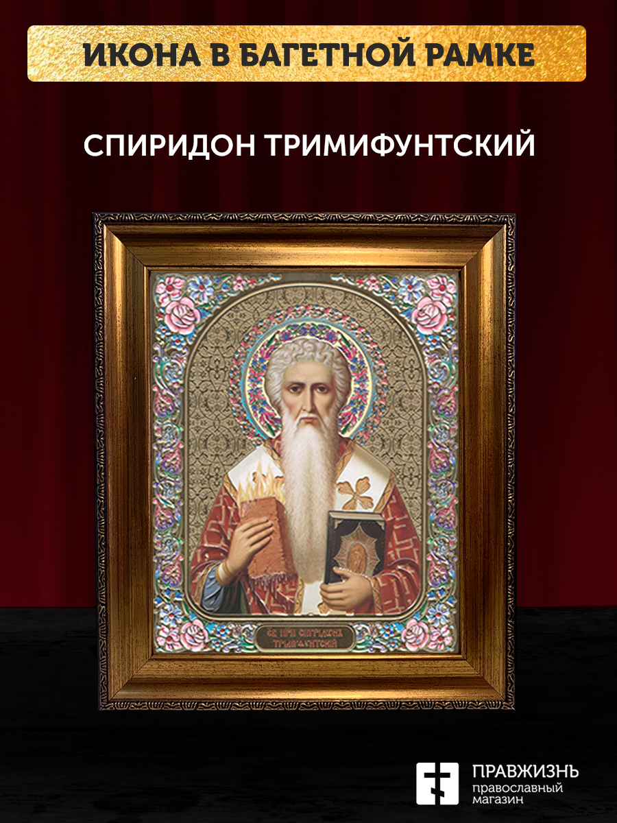 Икона Спиридон Тримифунтский, бронзовая багетная рамка узкая с узором 15х18 см