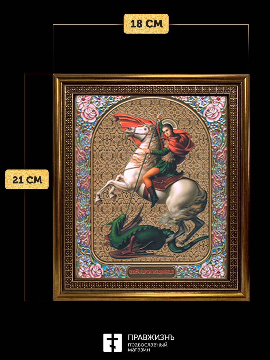 Икона Георгий Победоносец, бронзовая багетная рамка узкая с узором 15х18 см