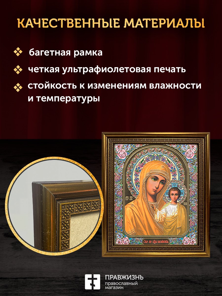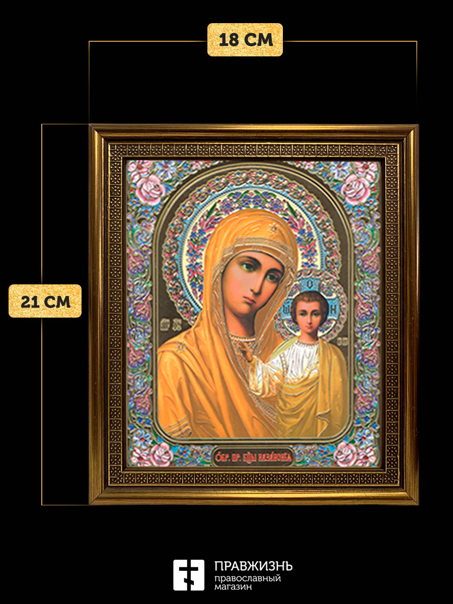 Икона Казанская Божия Матерь, бронзовая багетная рамка узкая с узором 15х18 см