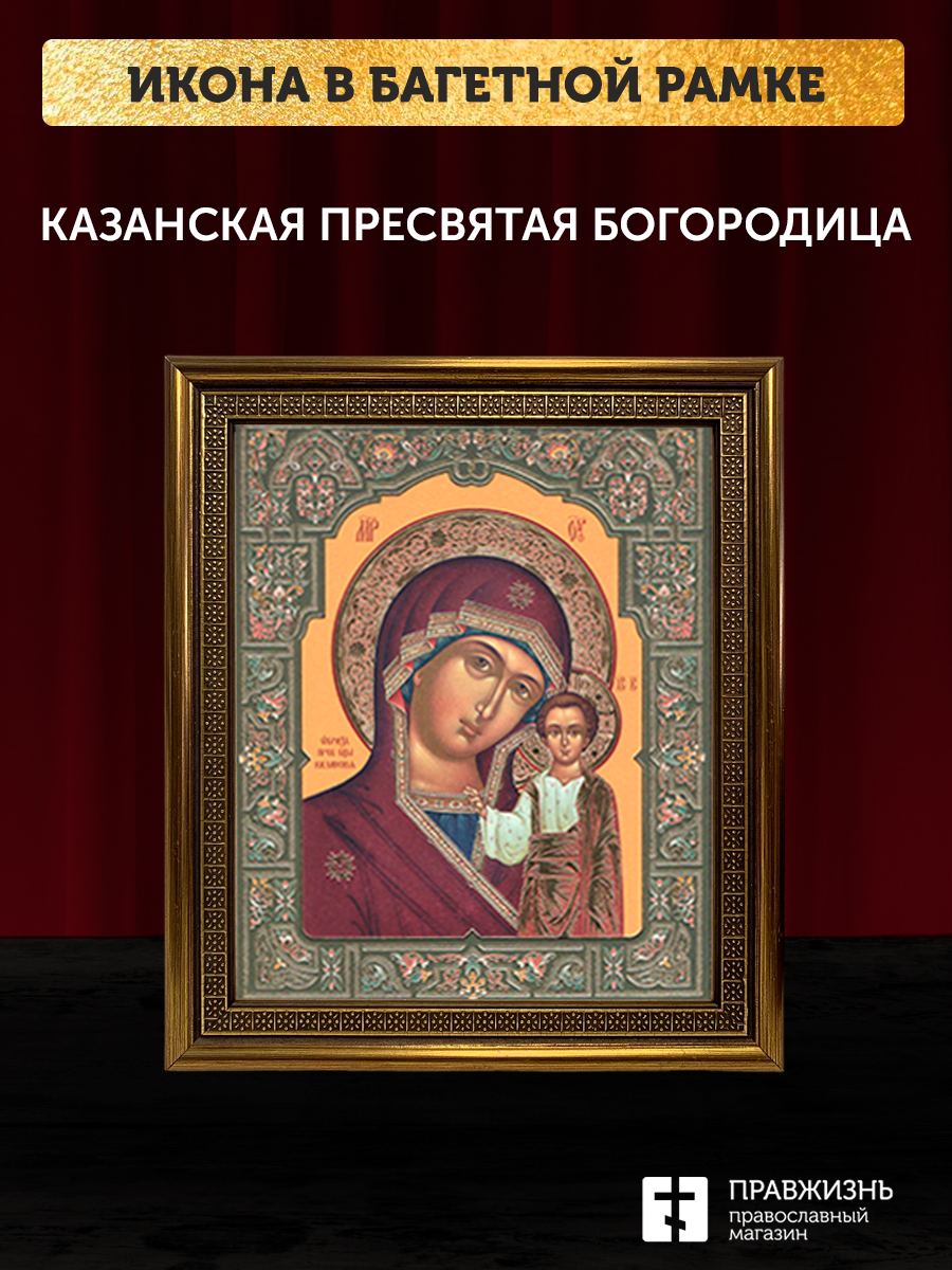 Икона Казанская Божия Матерь, бронзовая багетная рамка узкая с узором 15х18 см