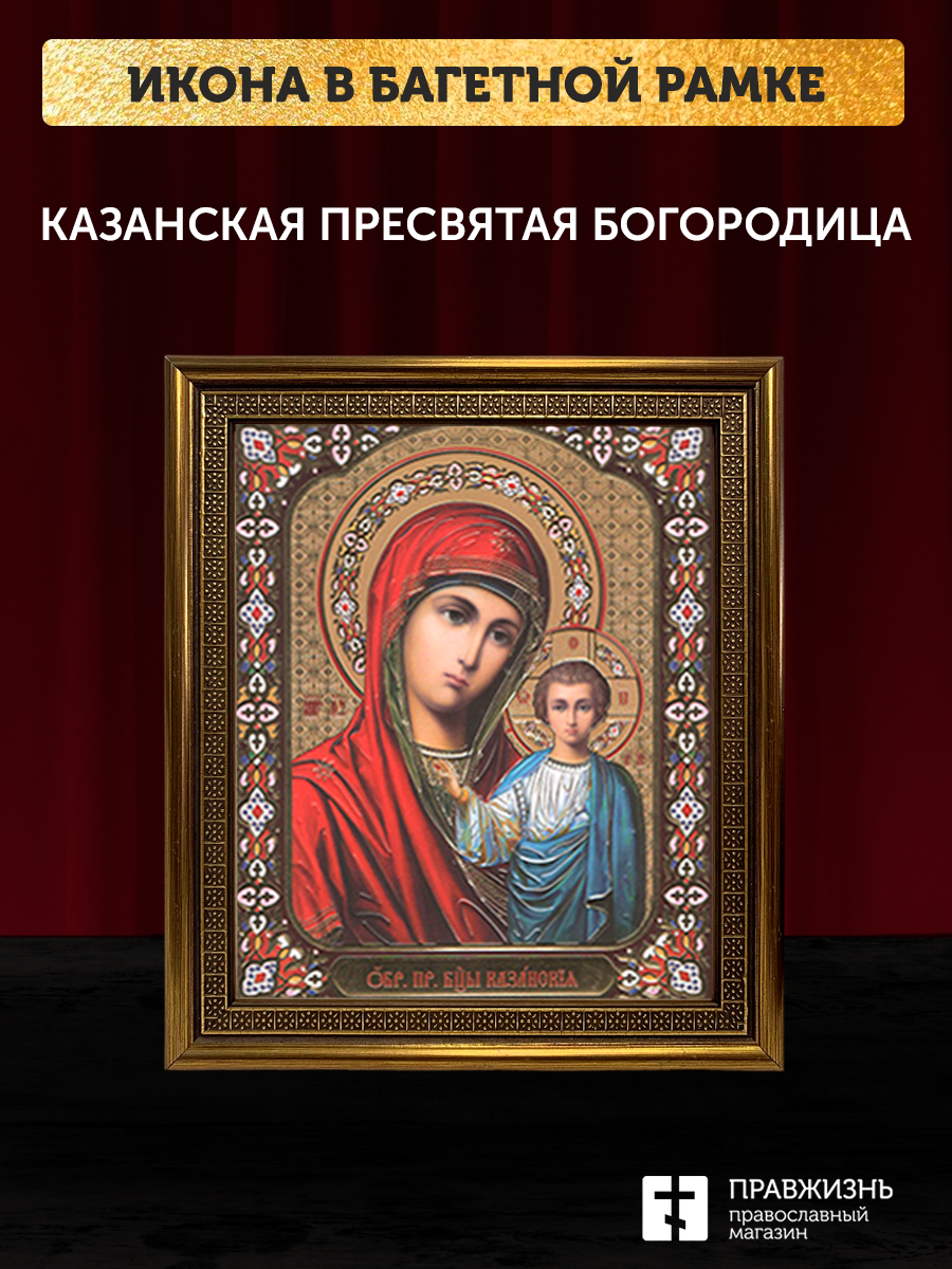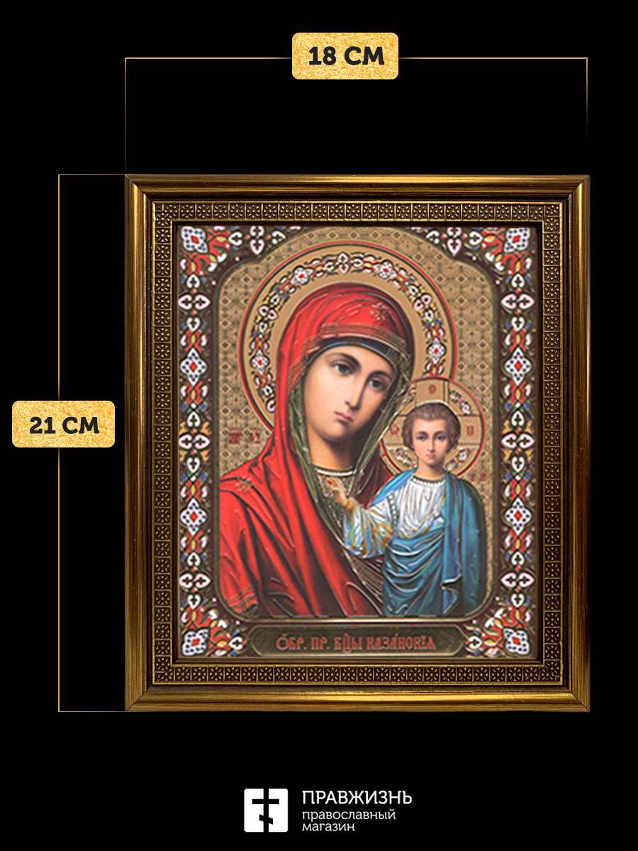 Икона Казанская Божия Матерь, бронзовая багетная рамка узкая с узором 15х18 см