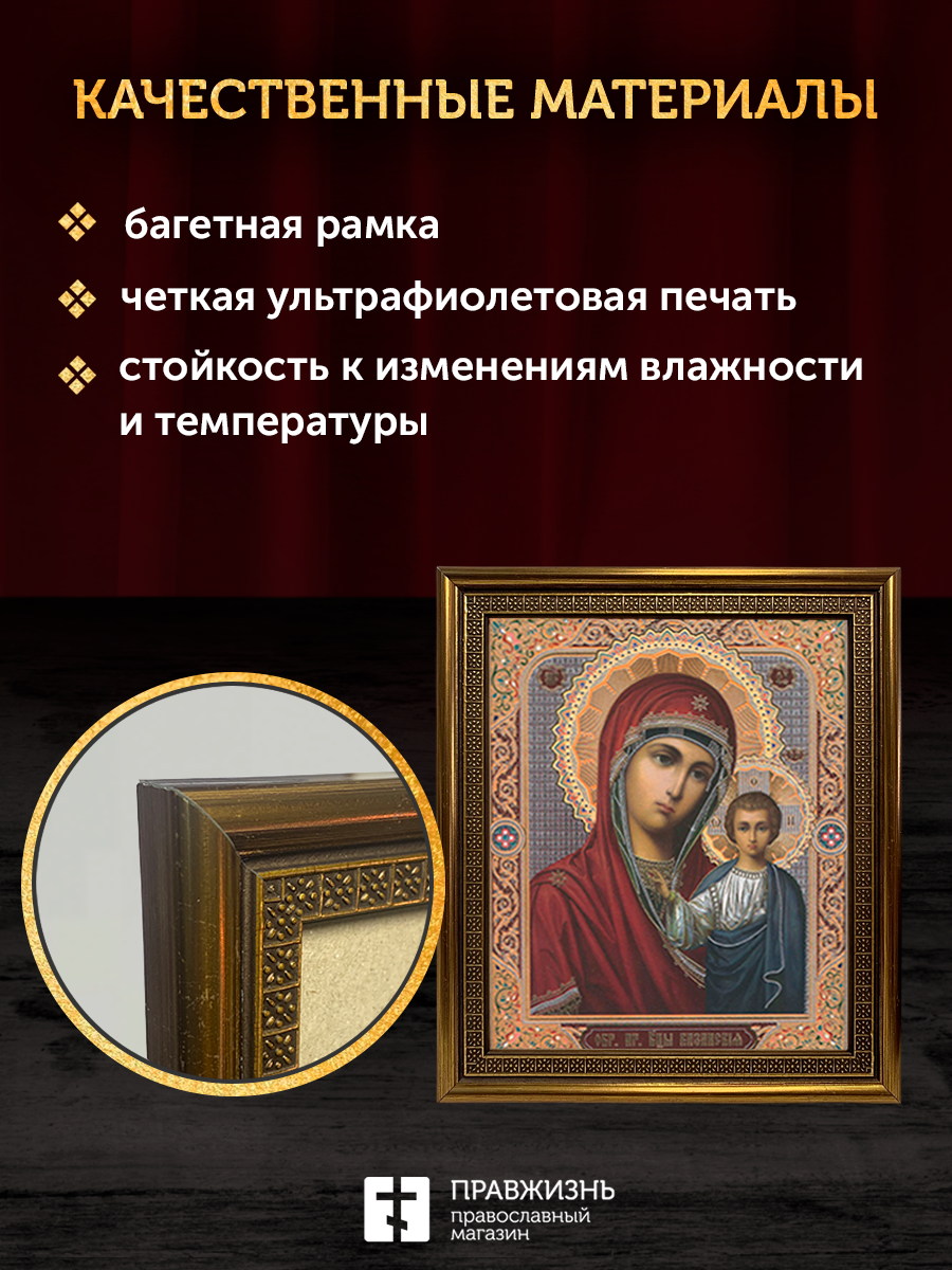 Икона Казанская Божия Матерь, бронзовая багетная рамка узкая с узором 15х18 см