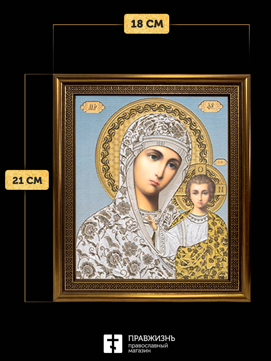 Икона Казанская Божия Матерь, бронзовая багетная рамка узкая с узором 15х18 см
