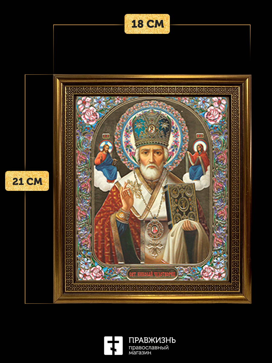 Икона Николай Чудотворец, бронзовая багетная рамка узкая с узором 15х18 см